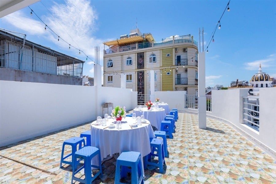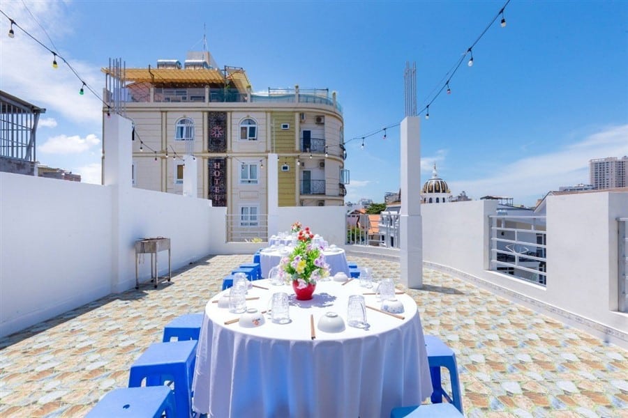 🍖 Sân BBQ tầng 3: Rộng rãi, có mái che, bàn ghế inox và dụng cụ nướng đầy đủ.