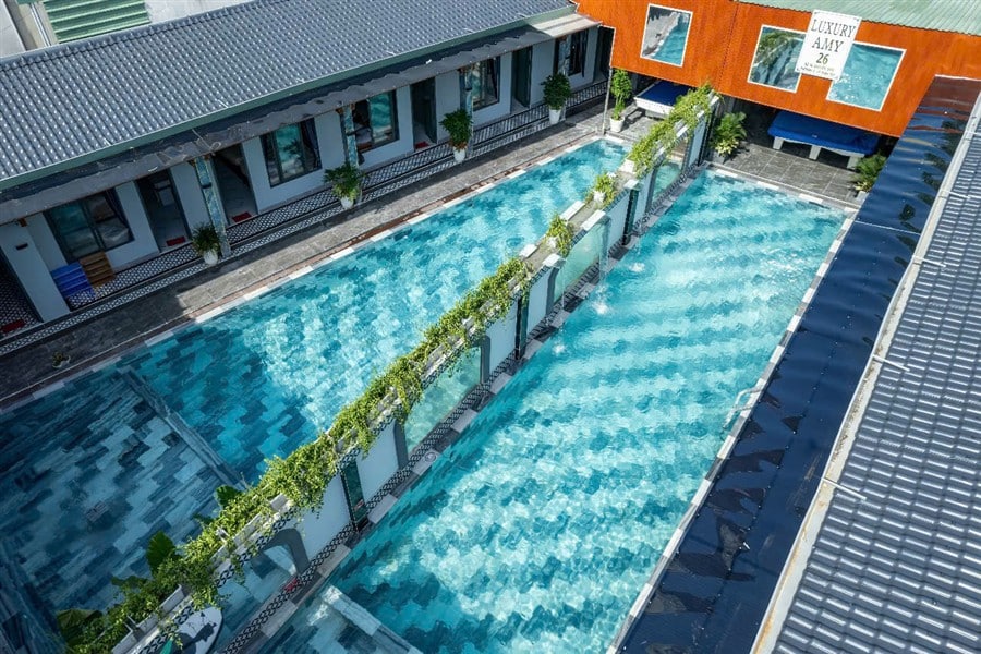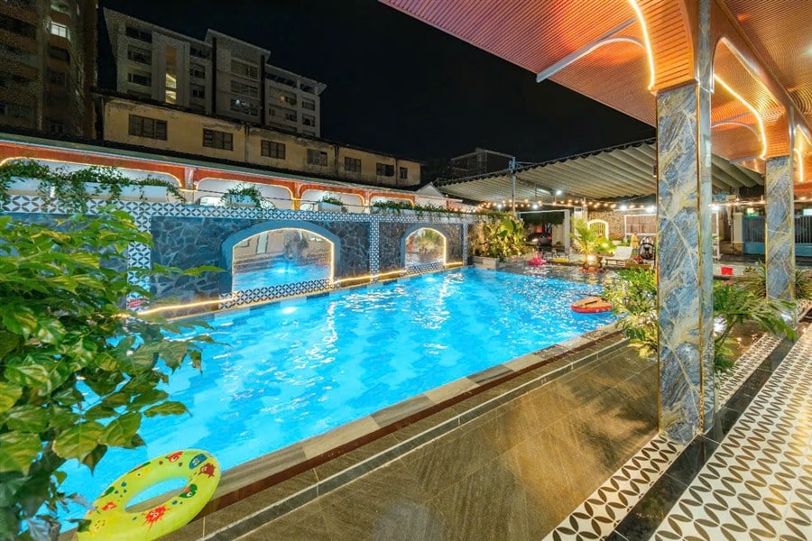 Hồ bơi: 150m², khu vực trẻ em 60cm, giàn phun nước, đèn đổi màu, phao bơi, sup miễn phí, máy bắn tạo bọt tuyết