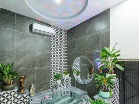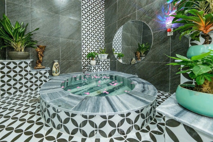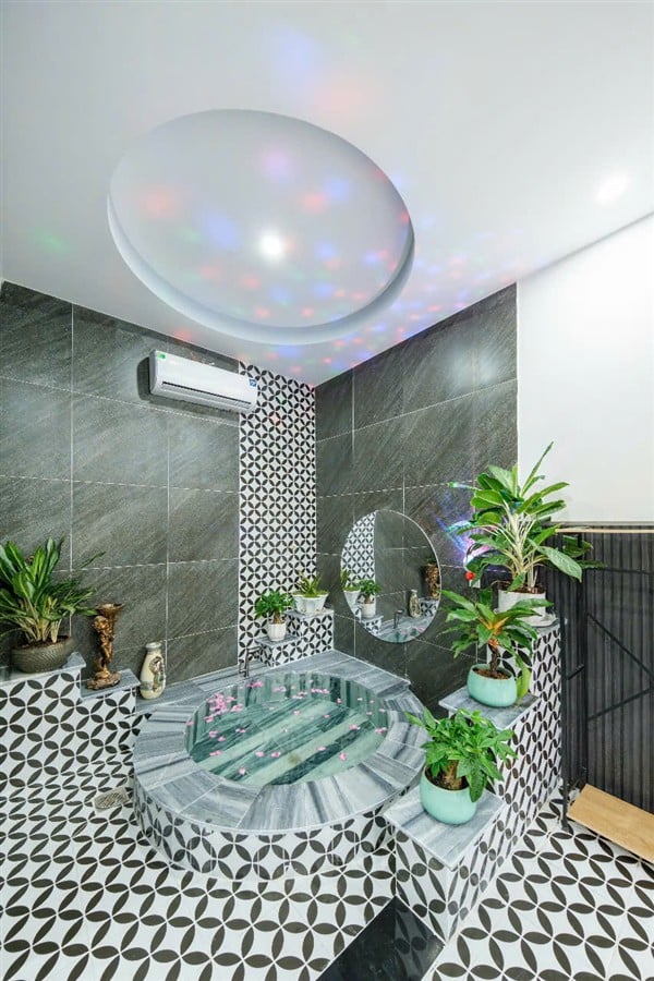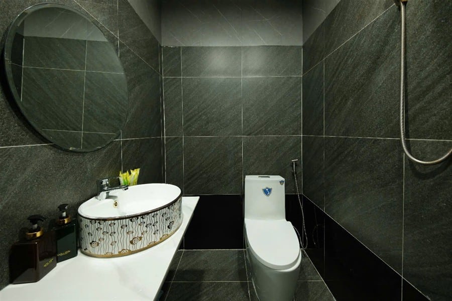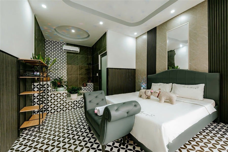 Tầng trệt: 1 phòng VIP với bồn tắm, 1 phòng đơn, 2 WC riêng; phòng khách máy lạnh rộng rãi, sofa sang trọng, TV màn hình lớn, khu vực giải trí với bàn bida miễn phí và phòng karaoke riêng cách âm 24/24.