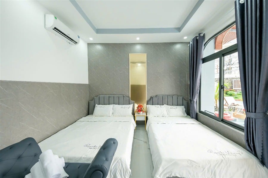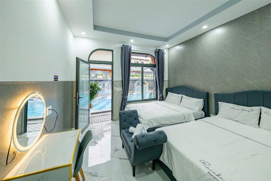 Các tầng trên: 5 phòng đôi, 6 WC, hầu hết phòng có view hồ bơi hoặc nội khu, nội thất hiện đại, máy lạnh, tủ quần áo, rèm chống muỗi.