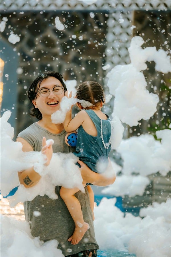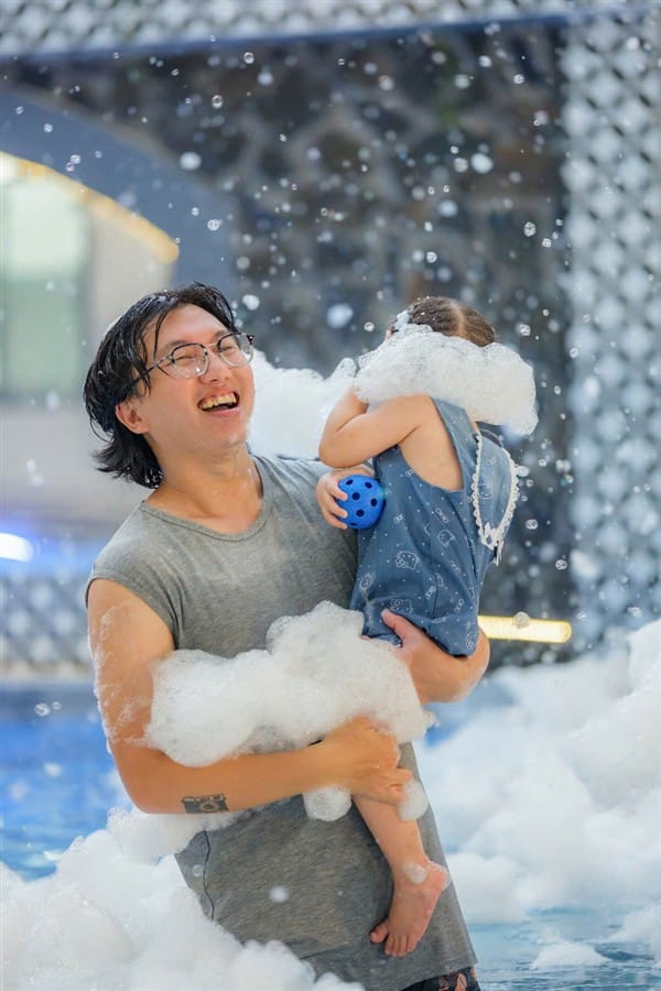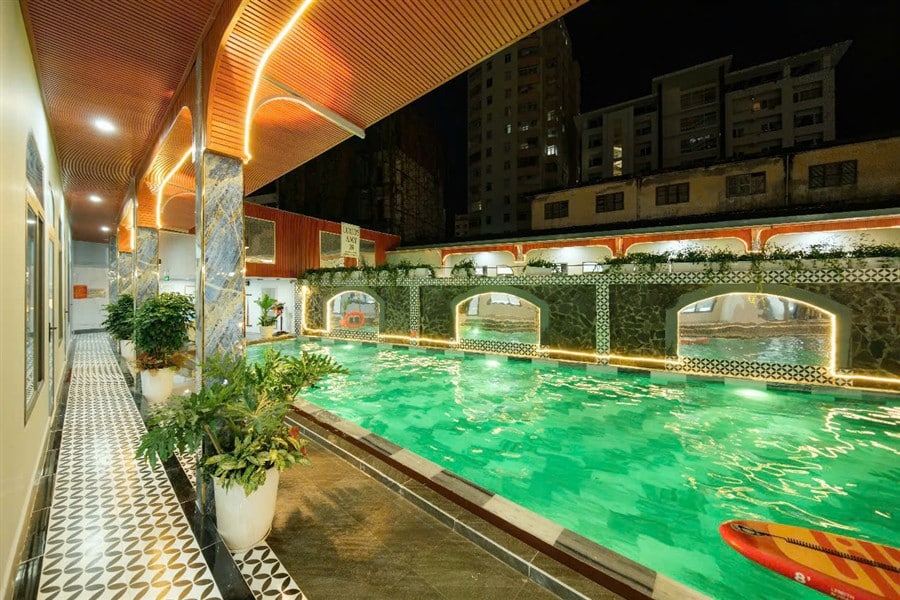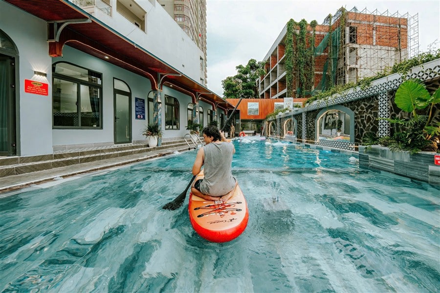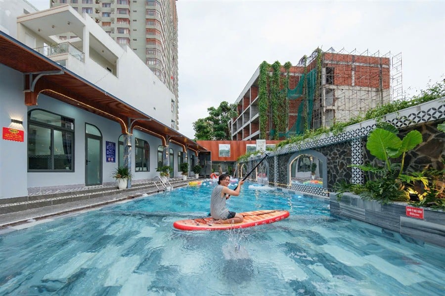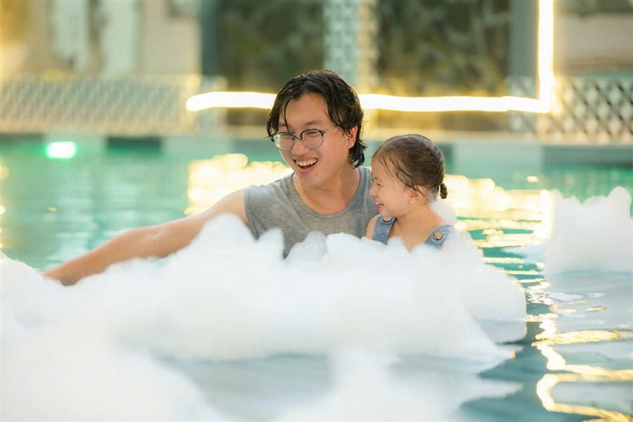 Hồ bơi chính 150m², khu vực trẻ em 60cm, giàn phun nước, đèn đổi màu, phao bơi, sup miễn phí, đặc biệt có máy bắn tạo bọt tuyết cho trải nghiệm độc đáo và vui nhộn.