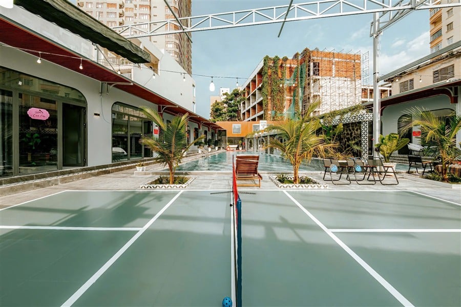 Sân pickleball mini miễn phí và khu vực thể thao ngoài trời, thích hợp cho cả trẻ em và người lớn.