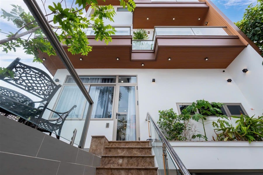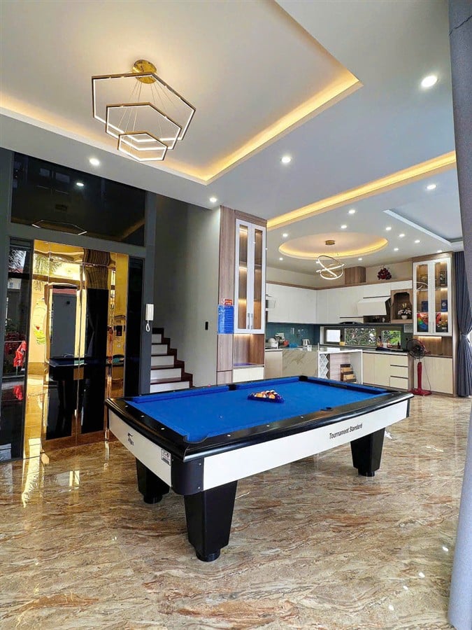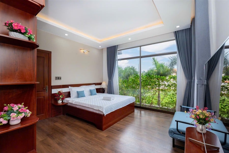 Homestay gồm 7 phòng ngủ, tổng 14 giường lớn và nhiều sofa bed, sức chứa tiêu chuẩn 15 khách và tối đa lên đến 30 khách lớn nhỏ với phụ phí bổ sung. Tầng trệt có phòng ngủ tích hợp karaoke với 5 sofa bed và WC riêng; tầng 1 gồm 2 phòng ngủ với giường đôi 1,8m kèm WC trong; tầng 2 gồm 3 phòng ngủ, 2 phòng sử dụng sofa bed với WC ngoài và 1 phòng có giường đôi kết hợp sofa bed. Tất cả các phòng đều được trang bị máy lạnh, ban công thoáng mát, tủ quần áo tiện nghi và nội thất hiện đại, mang đến trải nghiệm nghỉ dưỡng sang trọng, tiện nghi và thoải mái tối đa. Phòng khách rộng rãi với sofa sang trọng, TV màn hình lớn, khu vực giải trí với bàn bida, phòng karaoke cách âm và ghế massage, đáp ứng nhu cầu thư giãn và giải trí cho tất cả thành viên.
