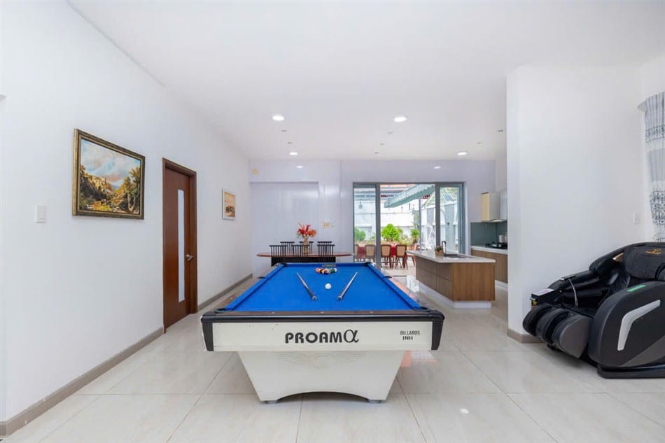 ✅ Phòng khách máy lạnh, sofa sang trọng, TV màn hình lớn, khu giải trí: bàn bida, karaoke VIP