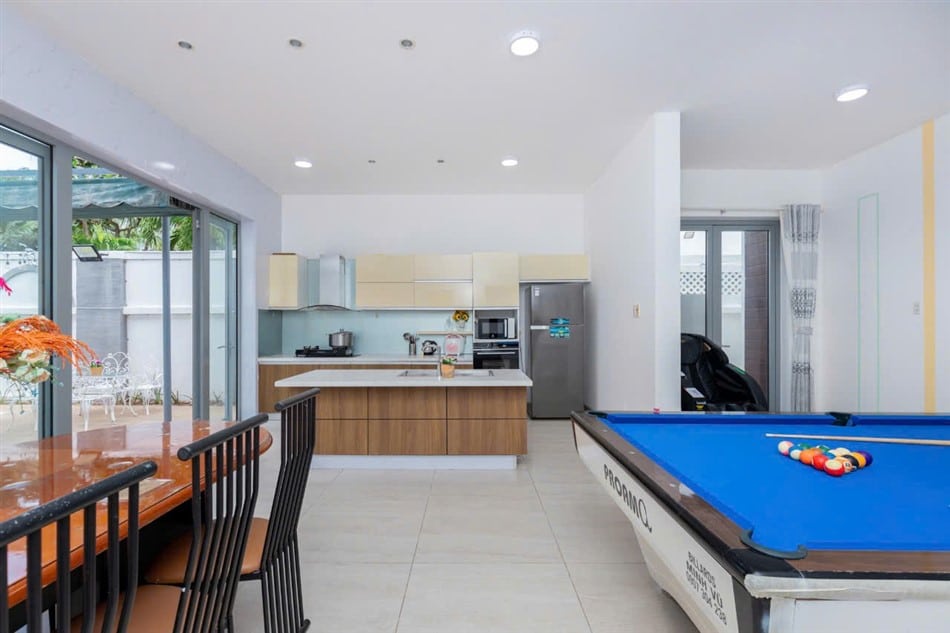 Bếp đầy đủ dụng cụ: bếp gas, lò nướng, chén dĩa, nồi, dao kéo, thớt, gia vị cơ bản, phục vụ nhu cầu nấu ăn và tổ chức tiệc. Homestay còn có máy giặt, khu vực phơi đồ, tủ lạnh cỡ lớn, quầy snack bar có tính phí. Quản gia hỗ trợ 24/7, đồng thời hỗ trợ check-in sớm nếu Homestay trống.