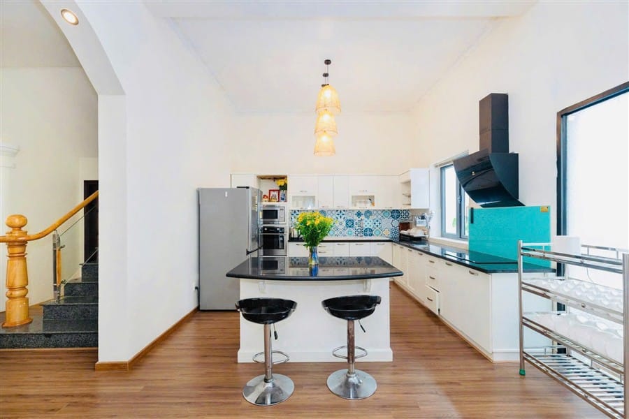 Đầy đủ dụng cụ nấu ăn: bếp gas, nồi cơm điện, lò vi sóng, tủ lạnh, bếp nướng BBQ.