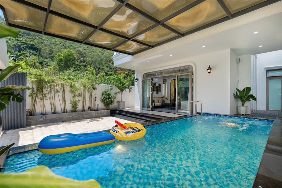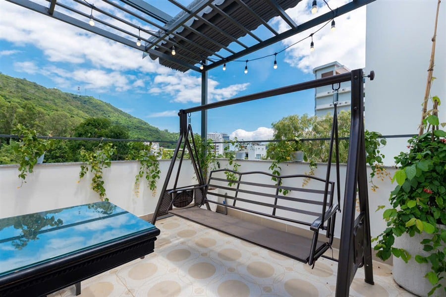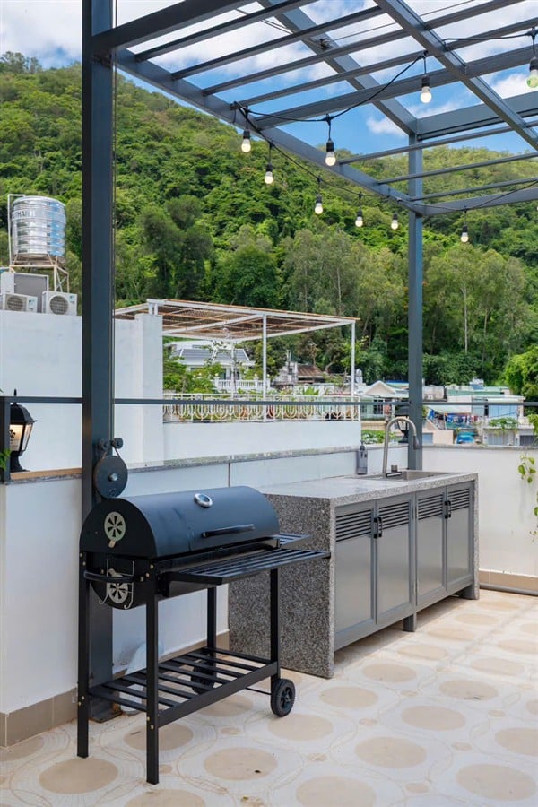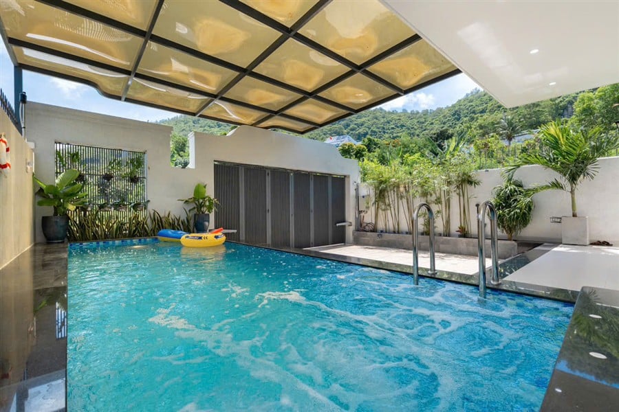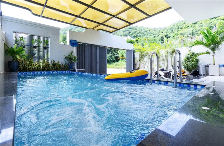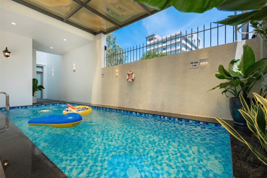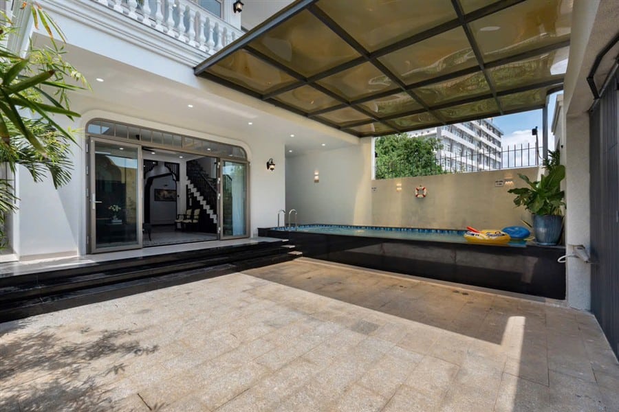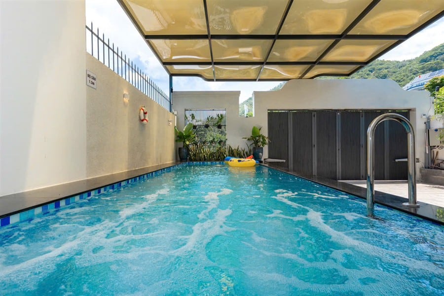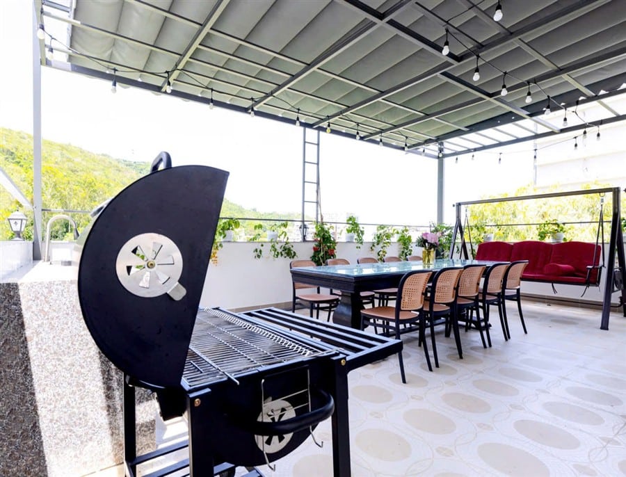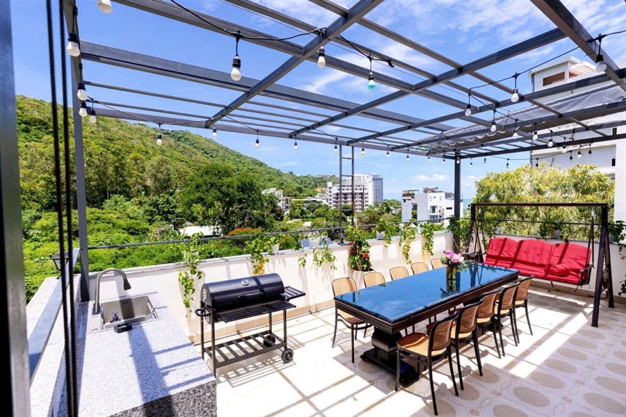 Tiện ích: ✅ Hồ bơi ngoài trời 25m² với phao bơi và đồ chơi hồ bơi ✅ Sân thượng rộng, khu vực BBQ với bếp nướng, bàn ăn lớn, ghế ngồi, xích đu, bàn inox phụ trợ