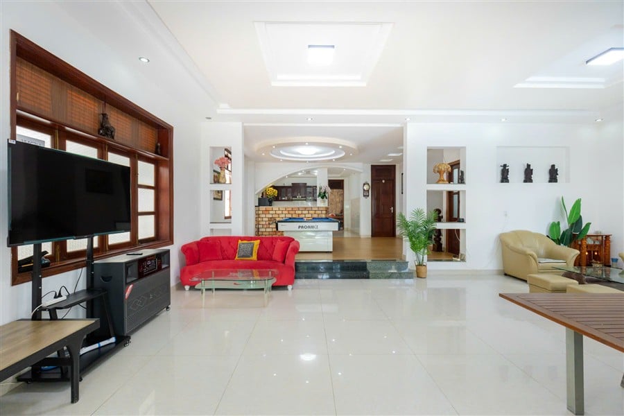 Phòng khách rộng rãi, máy lạnh, sofa sang trọng, TV màn hình lớn.