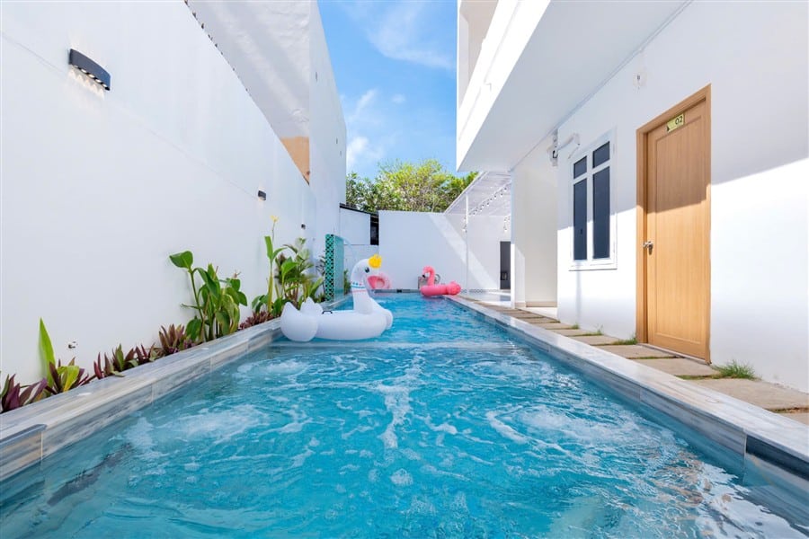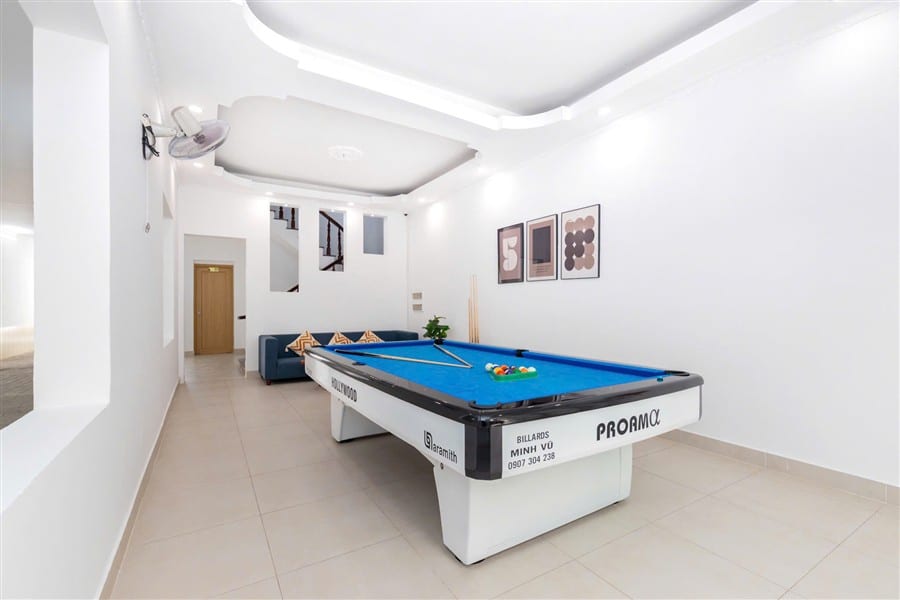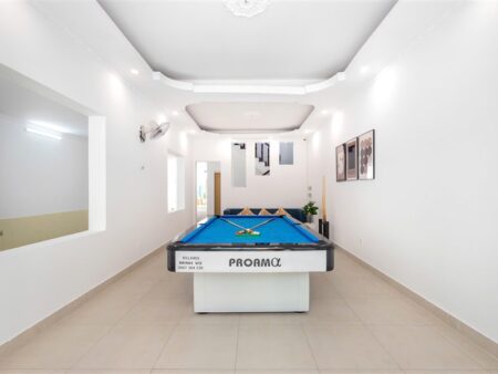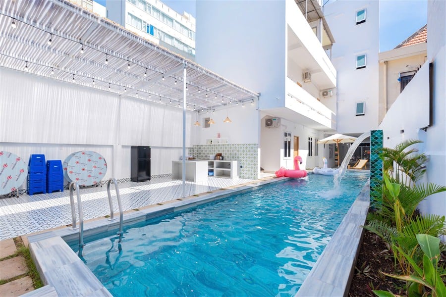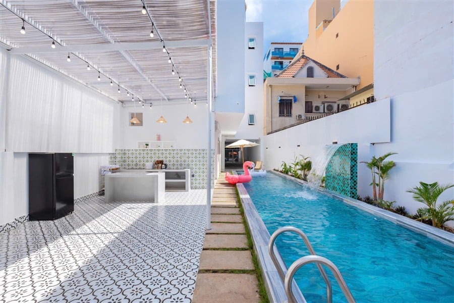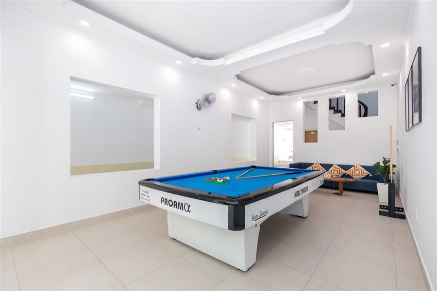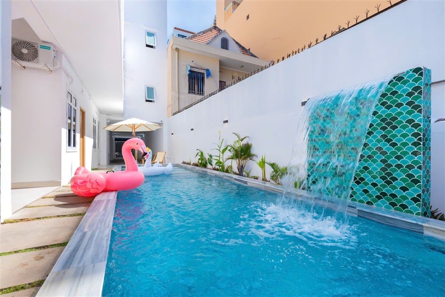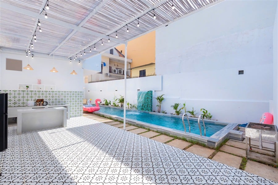 Tiện ích: ✅ Hồ bơi ngoài trời 60m2 có thác nước và sục massa ✅ Khu vực BBQ ngoài trời có mái che, bố trí 4–5 bàn tròn ✅ Phòng khách có bàn bida miễn phí ✅ Phòng karaoke riêng, không ảnh hưởng đến các phòng khác