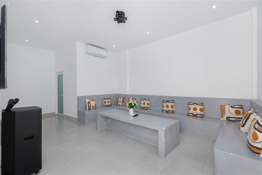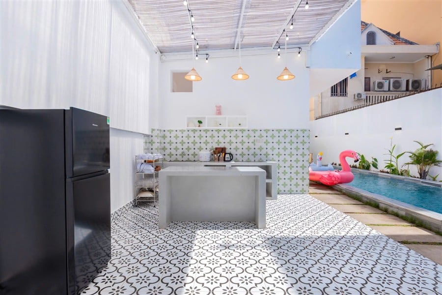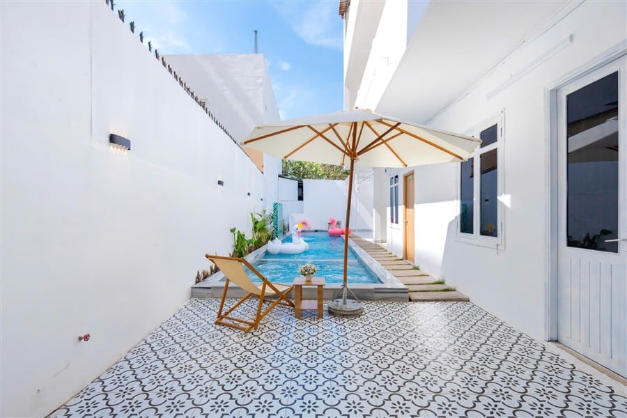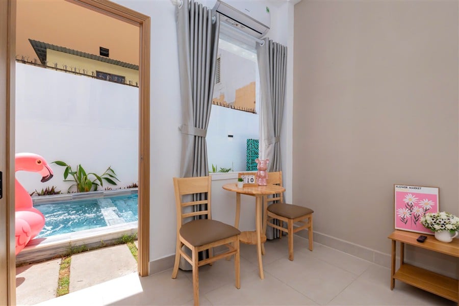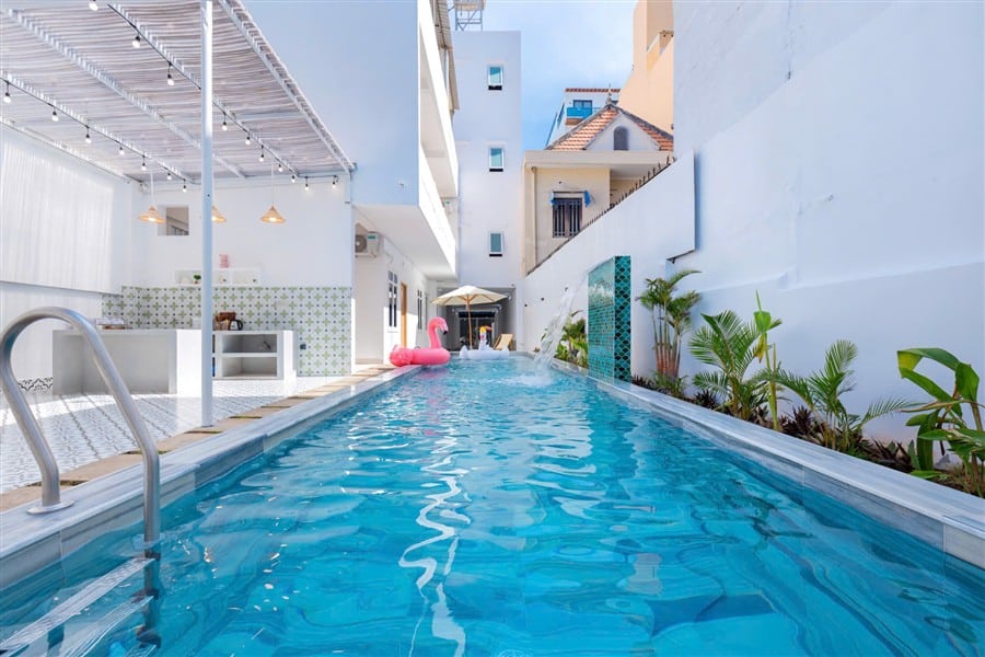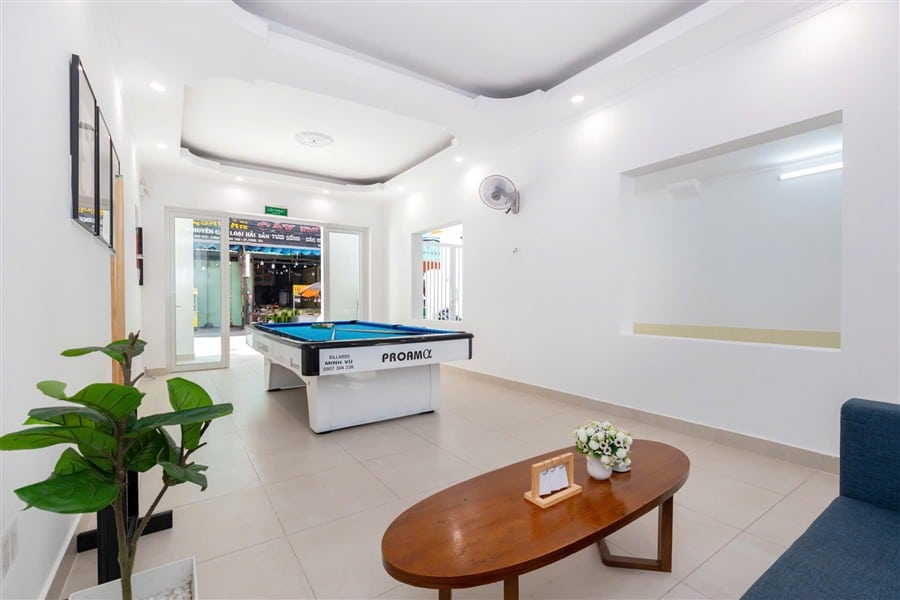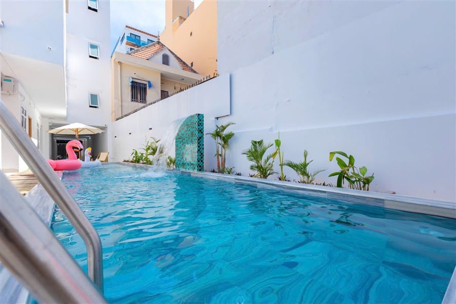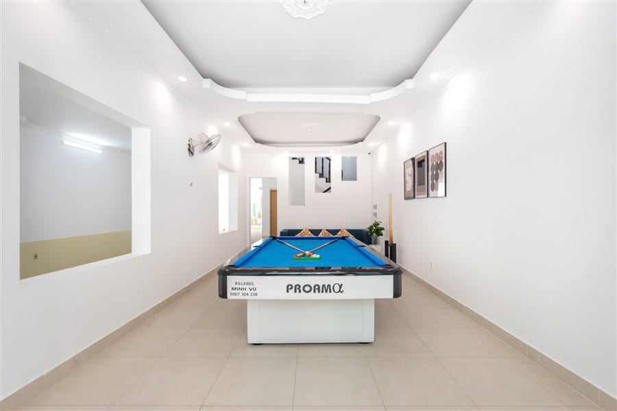 Tiện ích: ✅ Hồ bơi ngoài trời 60m2 có thác nước và sục massa ✅ Khu vực BBQ ngoài trời có mái che, bố trí 4–5 bàn tròn ✅ Phòng khách có bàn bida miễn phí ✅ Phòng karaoke riêng, không ảnh hưởng đến các phòng khác