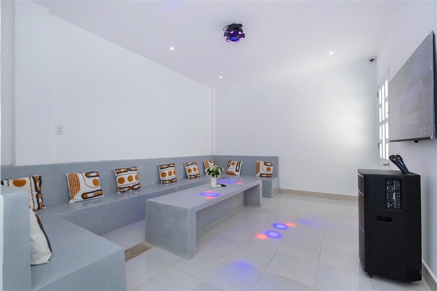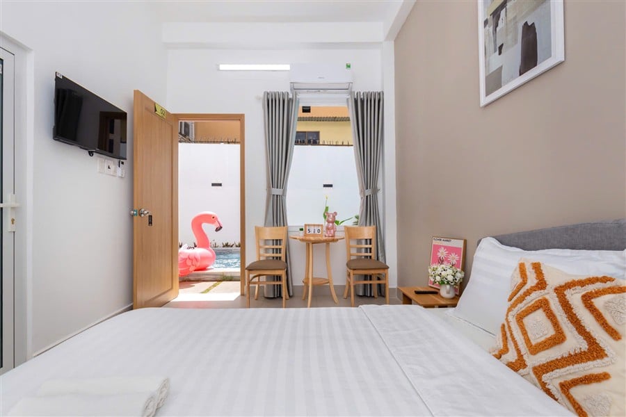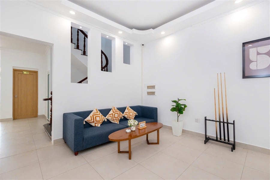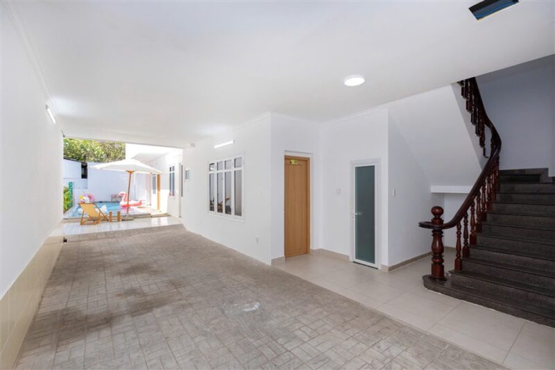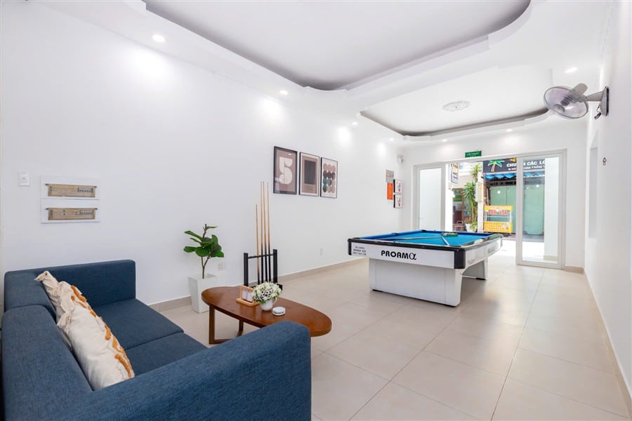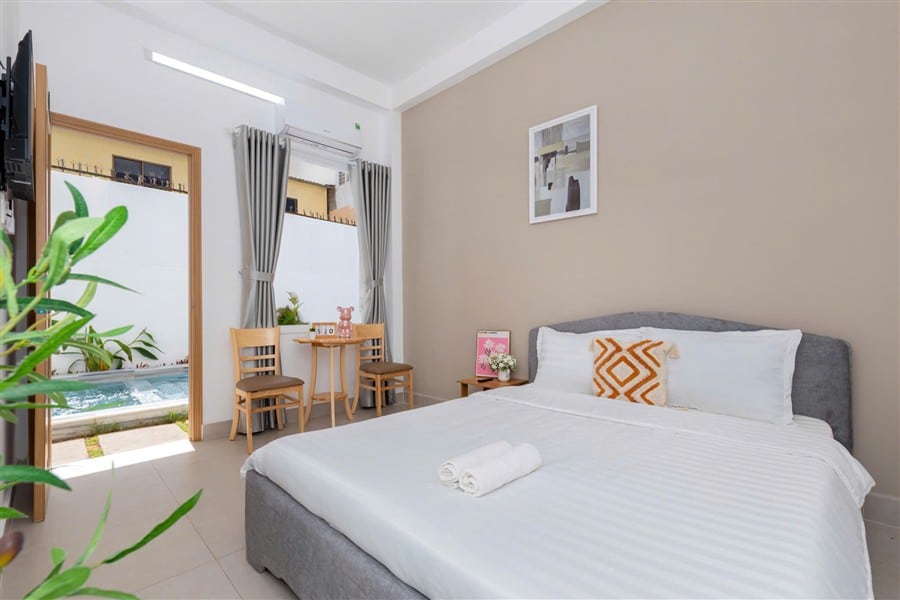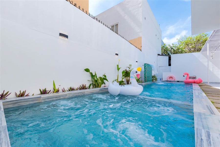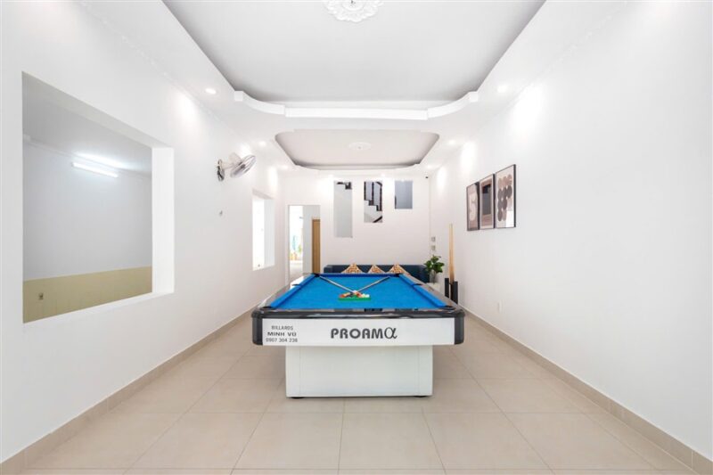 Tiện ích: ✅ Hồ bơi ngoài trời 60m2 có thác nước và sục massa ✅ Khu vực BBQ ngoài trời có mái che, bố trí 4–5 bàn tròn ✅ Phòng khách có bàn bida miễn phí ✅ Phòng karaoke riêng, không ảnh hưởng đến các phòng khác