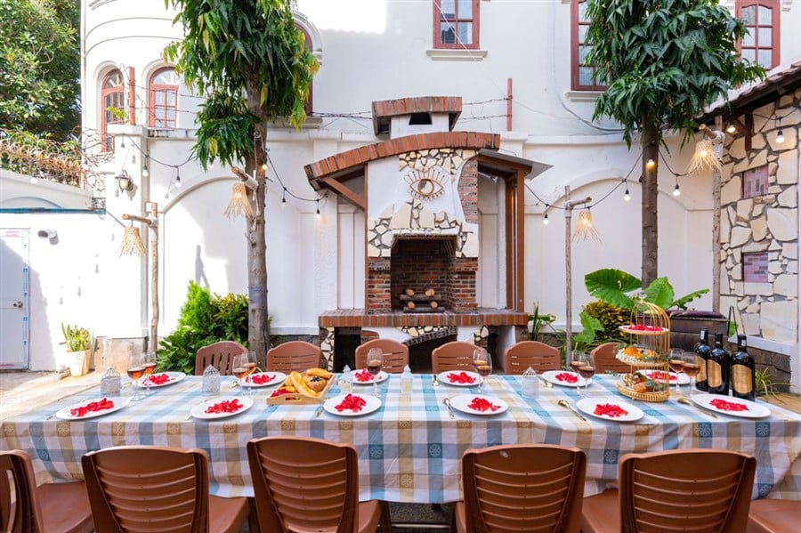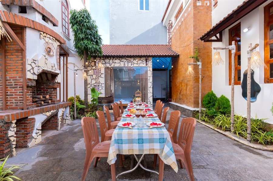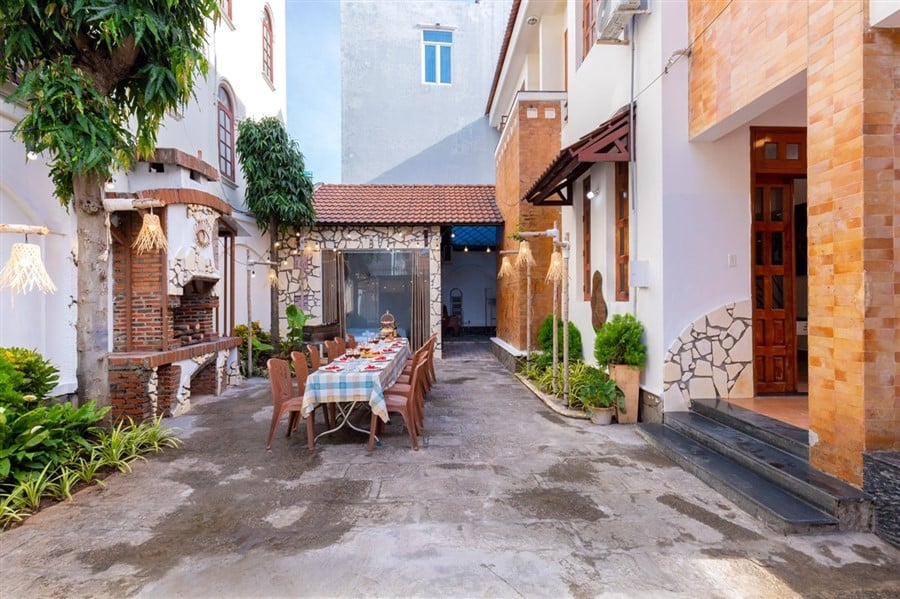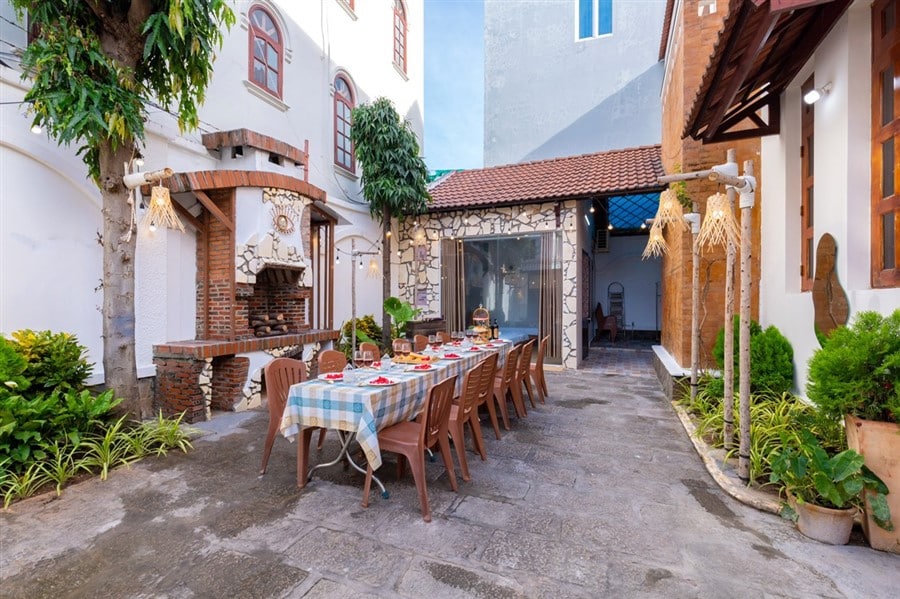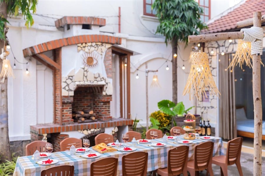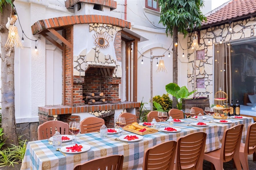 ✅ Sân BBQ đầy đủ bàn ghế, bếp nướng, dụng cụ nấu ăn tiện lợi.