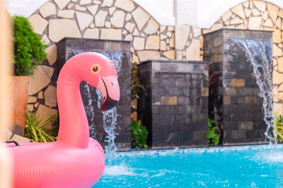 Hồ bơi riêng 35m² có thác nước, tạo cảm giác thư giãn như resort.