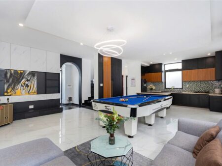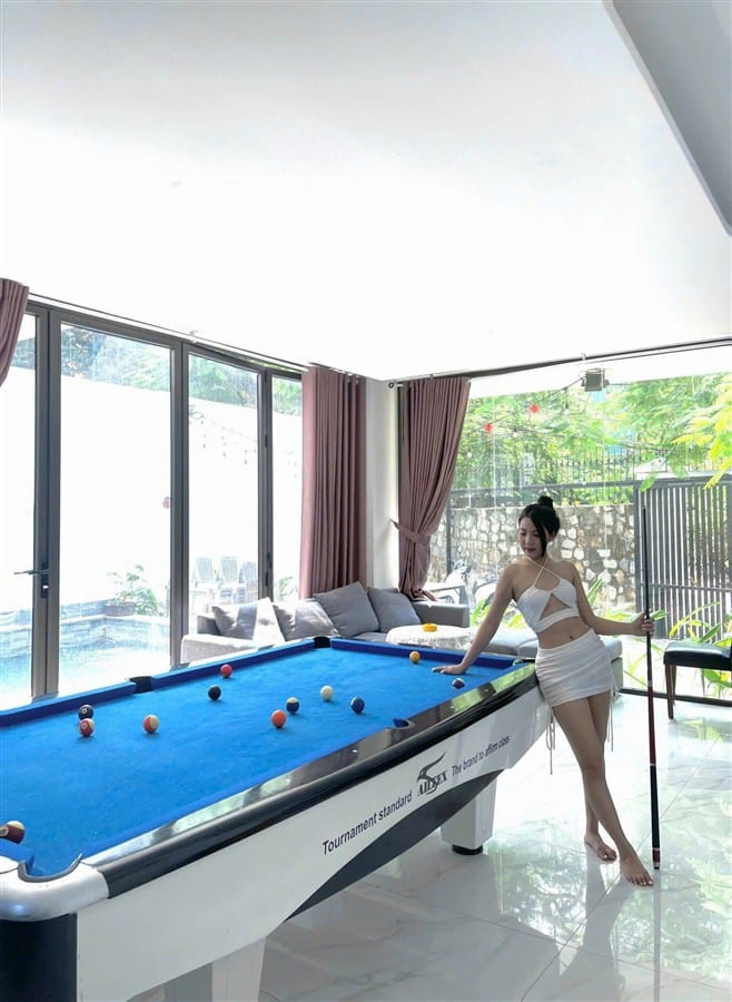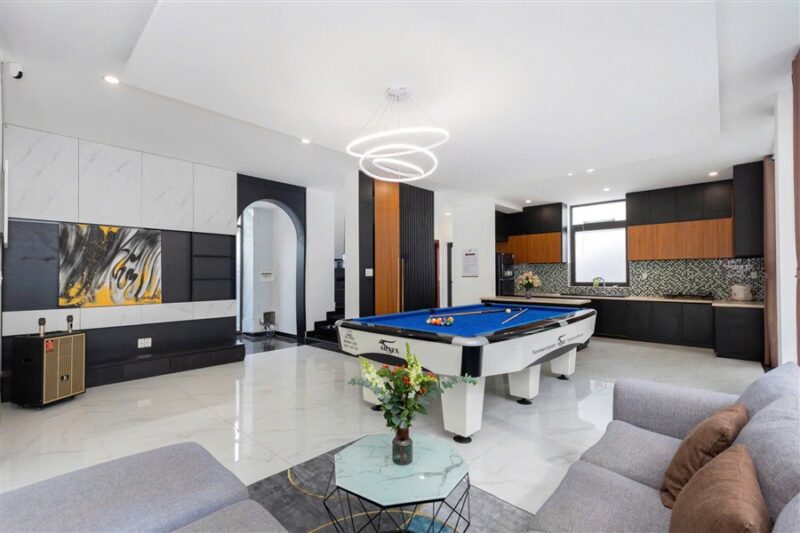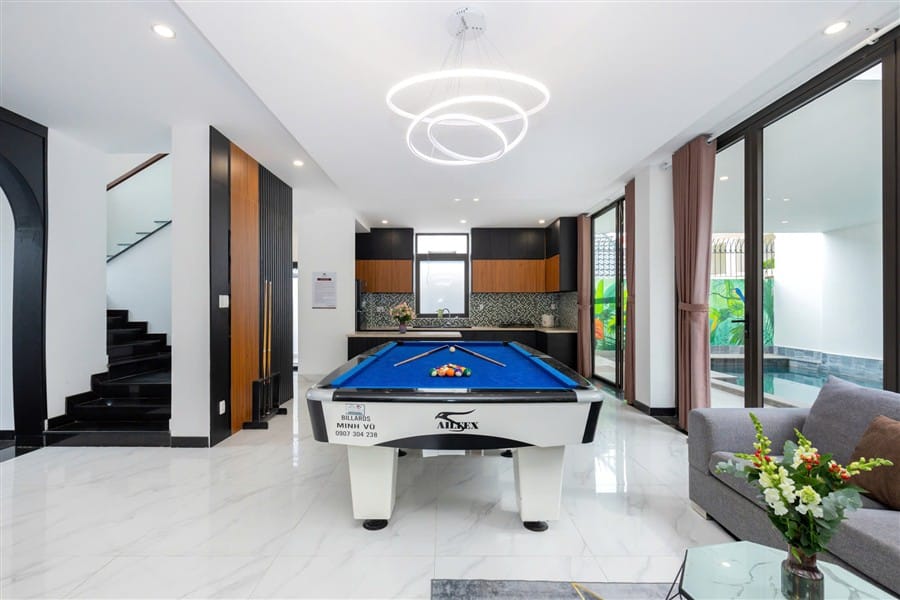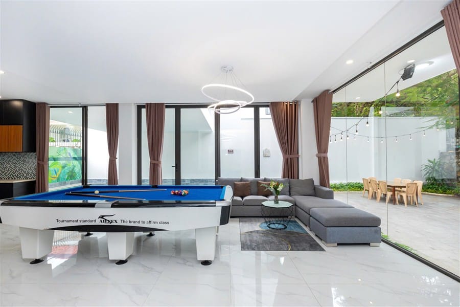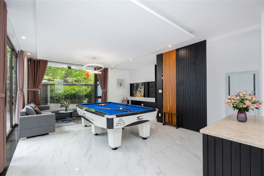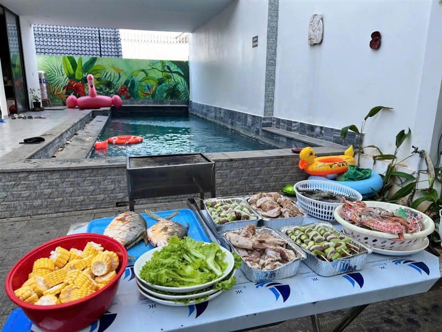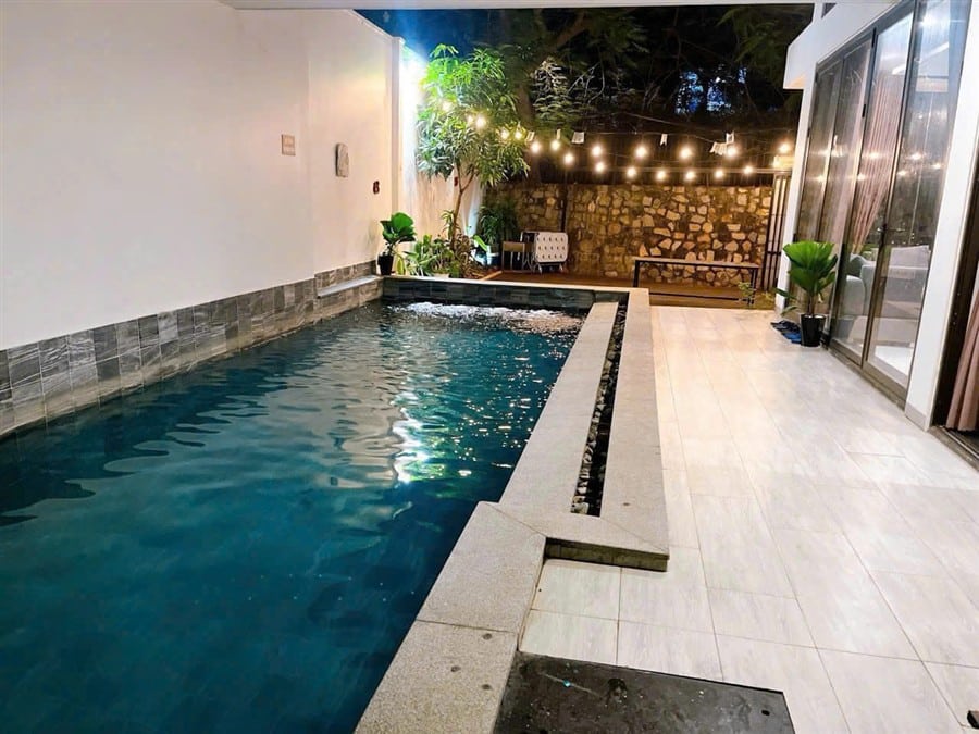 Homestay Villa được bố trí 5 phòng ngủ với 8 giường lớn, 2 nệm phụ, ghế sofa và 6 phòng vệ sinh (2 phòng đơn, 3 phòng đôi), đáp ứng nhu cầu nghỉ dưỡng cho nhóm từ 15–25 khách. Hồ bơi 50m² có sục massage, khu vực riêng cho trẻ em và bậc thang tăng cấp cùng áo phao đầy đủ, mang đến trải nghiệm thư giãn và an toàn. Sân rộng, sân thượng thoáng mát, kết hợp khu vực BBQ ngoài trời và bếp đầy đủ dụng cụ giúp du khách tận hưởng kỳ nghỉ tiện nghi và trọn vẹn.