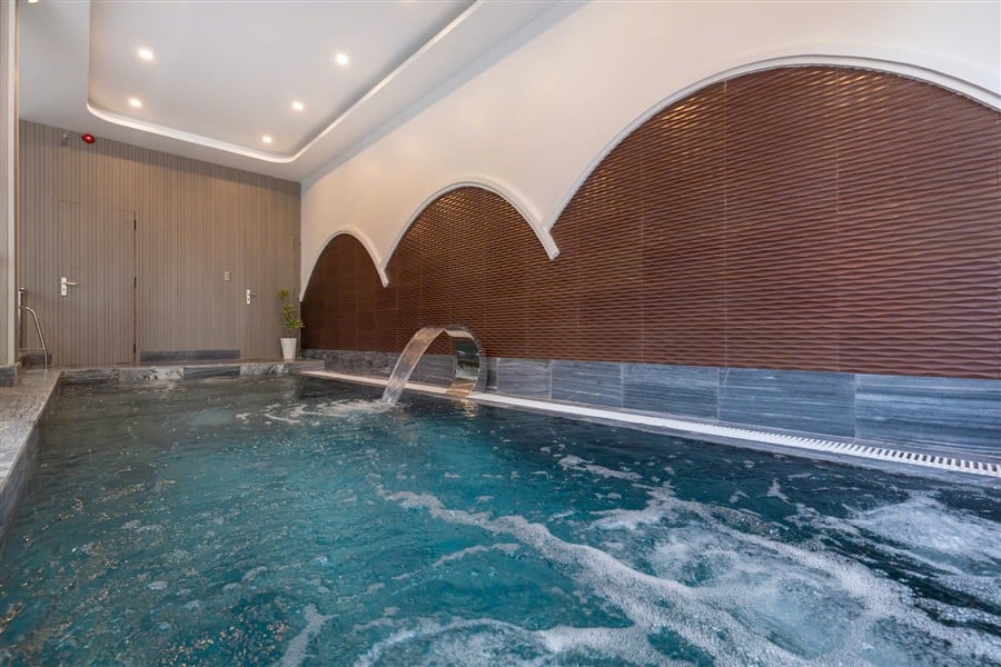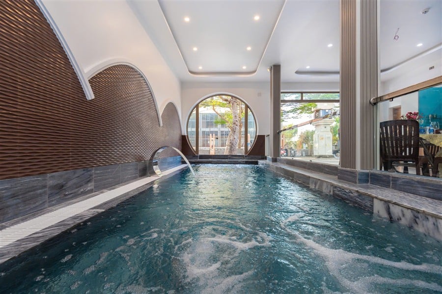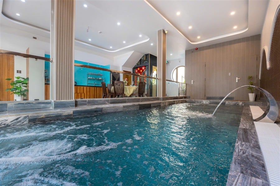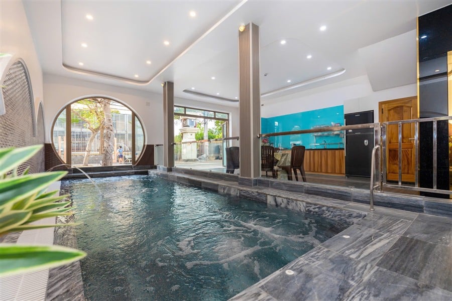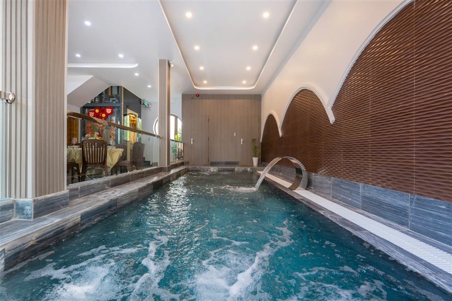 Homestay Villa được bố trí 4 phòng ngủ với tổng cộng 10 giường lớn, 6 phòng vệ sinh riêng, sức chứa tối đa 20 khách. Hồ bơi trong nhà rộng 30m², sâu từ 0,5–1,6m, kết hợp phòng karaoke, bàn bida, ghế massage và máy game giải trí (có phí) mang đến trải nghiệm thư giãn và vui chơi trọn vẹn. Sân BBQ ngoài trời rộng rãi, cùng bếp đầy đủ dụng cụ nấu ăn, bàn ghế và gia vị cơ bản, giúp tổ chức tiệc nhóm hoặc liên hoan gia đình dễ dàng.