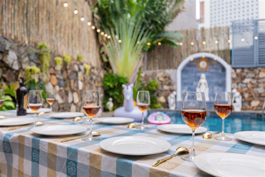 Ghi chú: Hồ bơi riêng 50m²: Thiết kế hiện đại, có khu vực cho trẻ em và đèn đổi màu ban đêm.