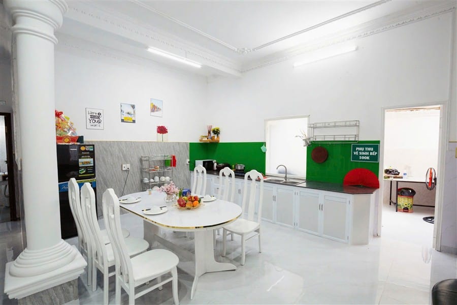 Bếp đầy đủ dụng cụ: bếp gas, lò nướng BBQ, nồi, chén dĩa, dao kéo, thớt, gia vị cơ bản, phục vụ nhu cầu nấu ăn và tổ chức tiệc. Homestay còn có máy giặt, khu vực phơi đồ, tủ lạnh cỡ lớn, quầy snack bar tính phí. Quản gia hỗ trợ 24/7, hỗ trợ check-in sớm nếu Homestay trống.