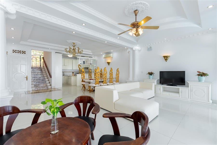 ✅ Phòng khách rộng 40m², trang bị tivi, sofa, máy lạnh, view hồ bơi và sân vườn.