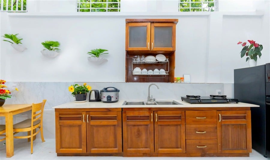 ✅ Bếp nấu ăn tiện nghi: đầy đủ nồi niêu, chén dĩa, bếp gas, lò nướng, dao thớt, gia vị cơ bản.