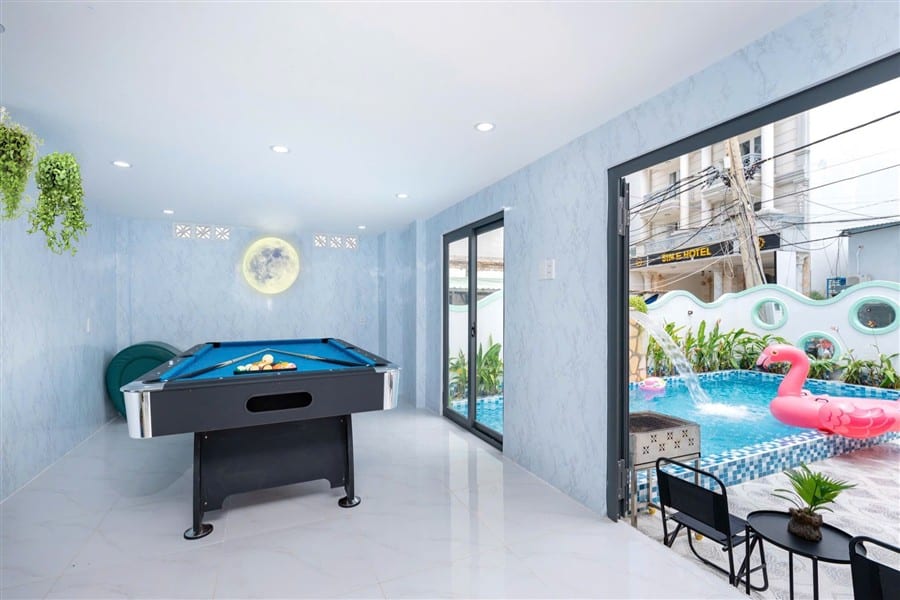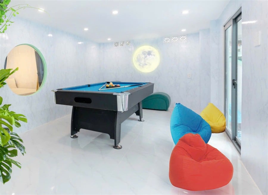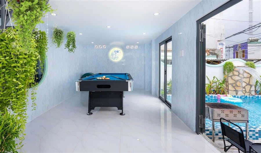Không gian hiện đại, đầy đủ tiện nghi: karaoke, bida, BBQ, sân chill ngoài trời.