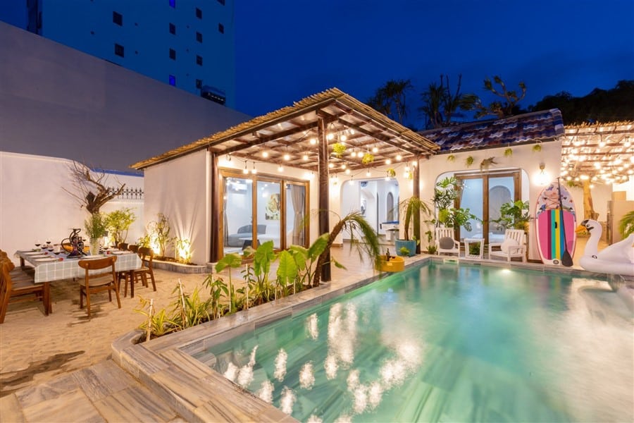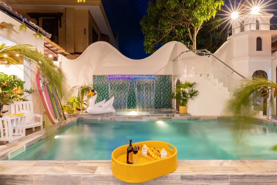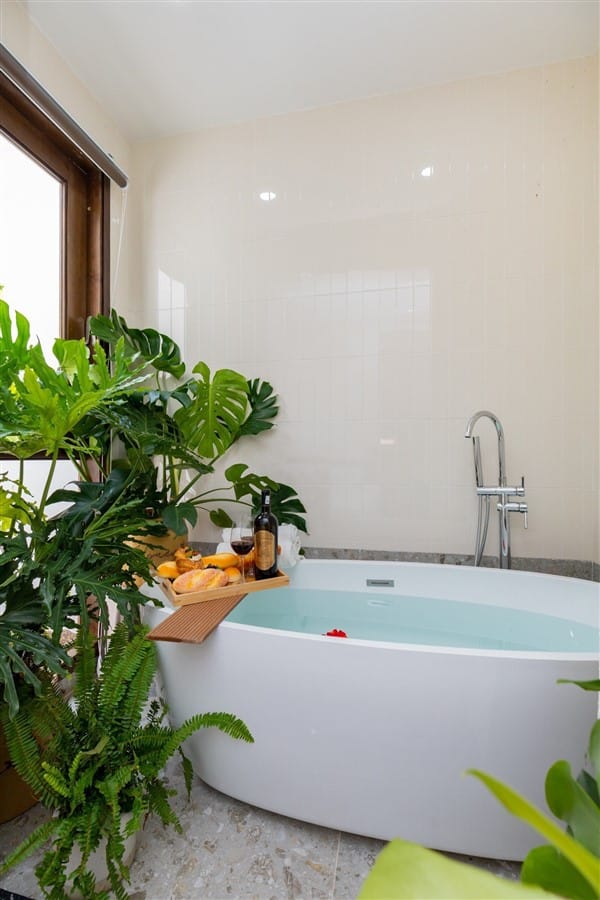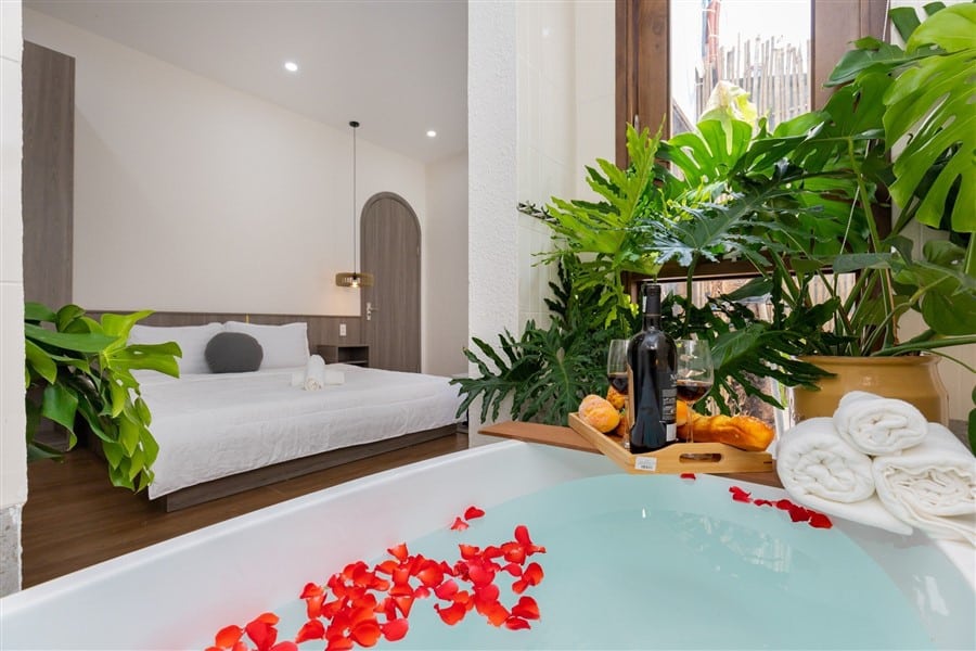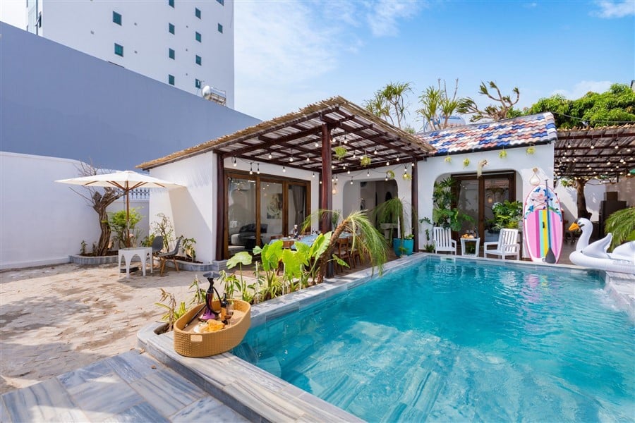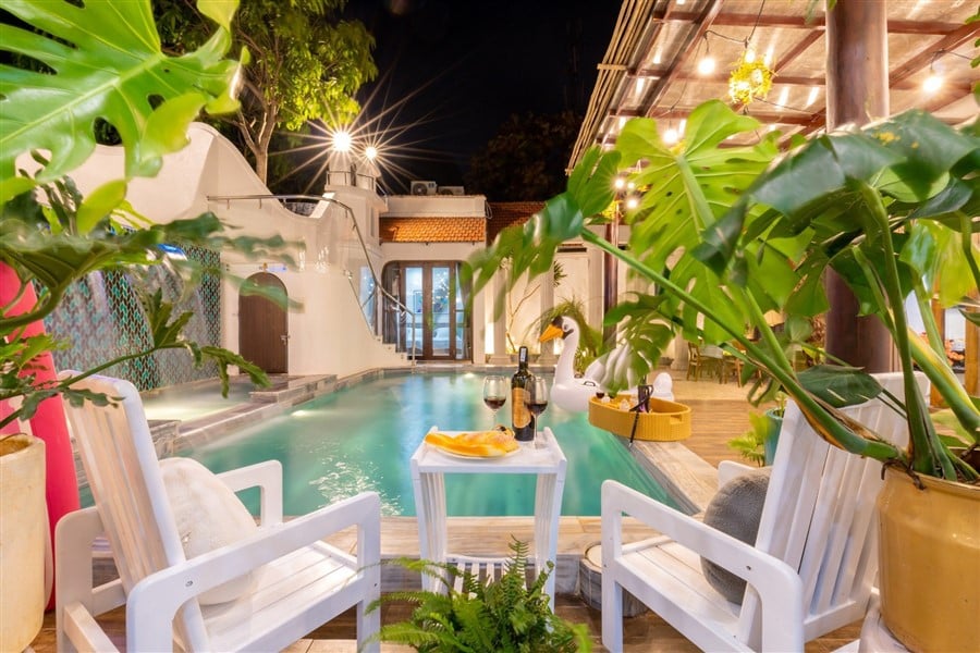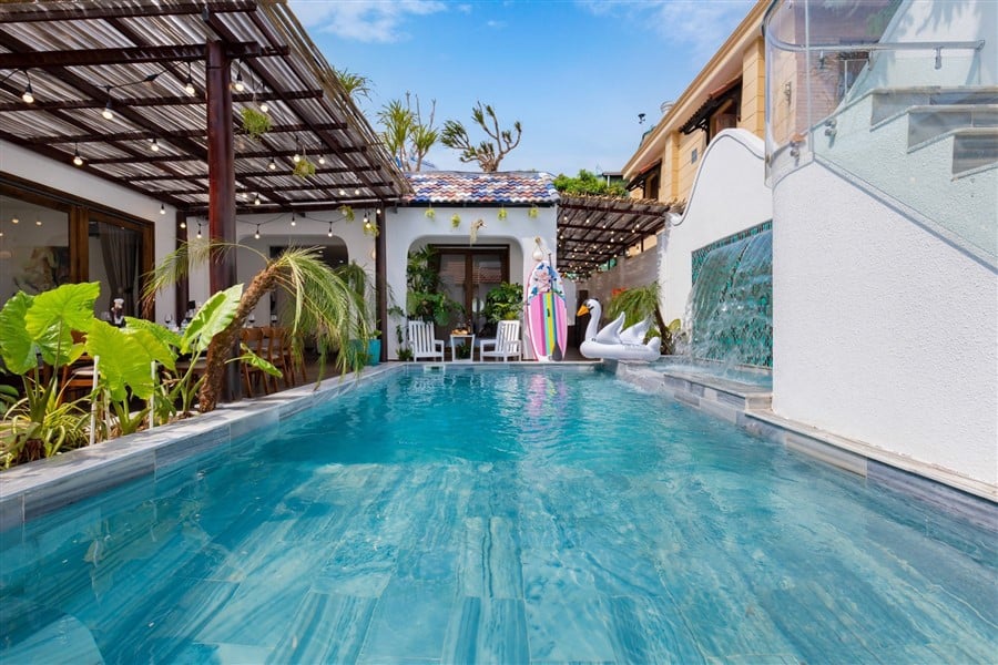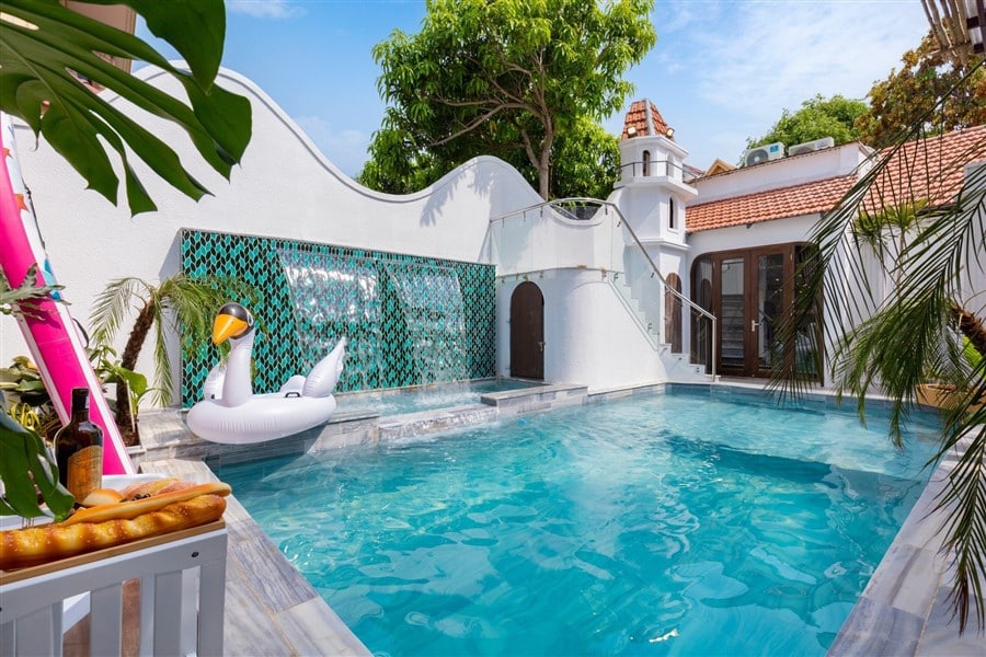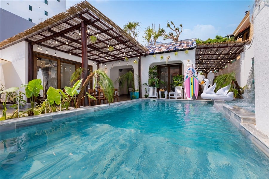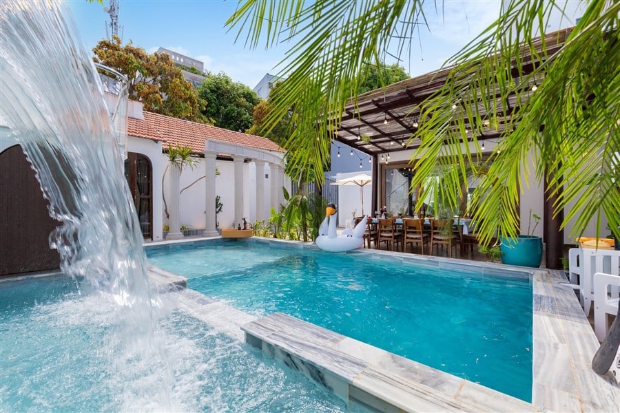 ✅ Hồ bơi riêng siêu lớn 60m², có thác nước và góc check-in bồn tắm ngoài trời cực chill.