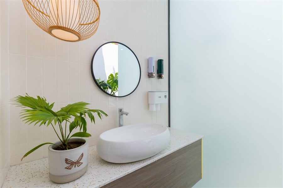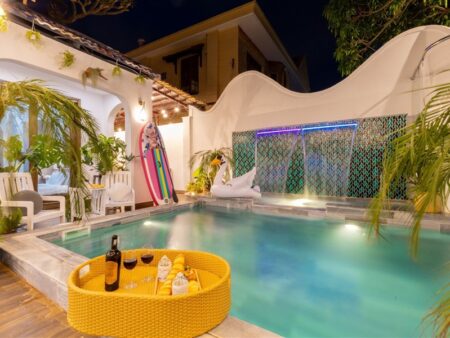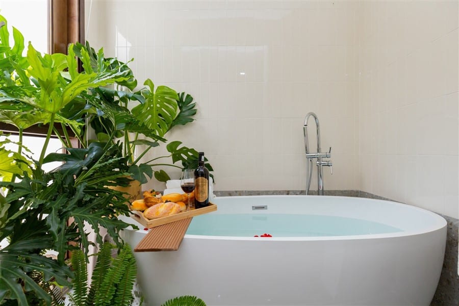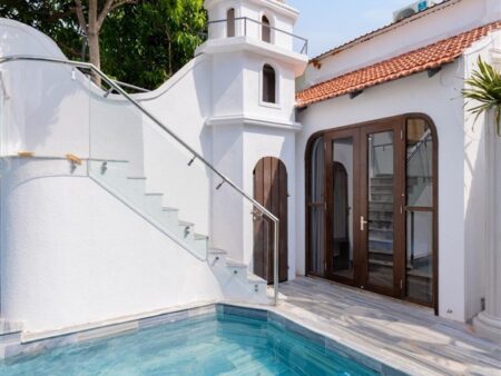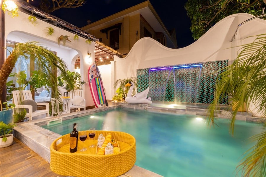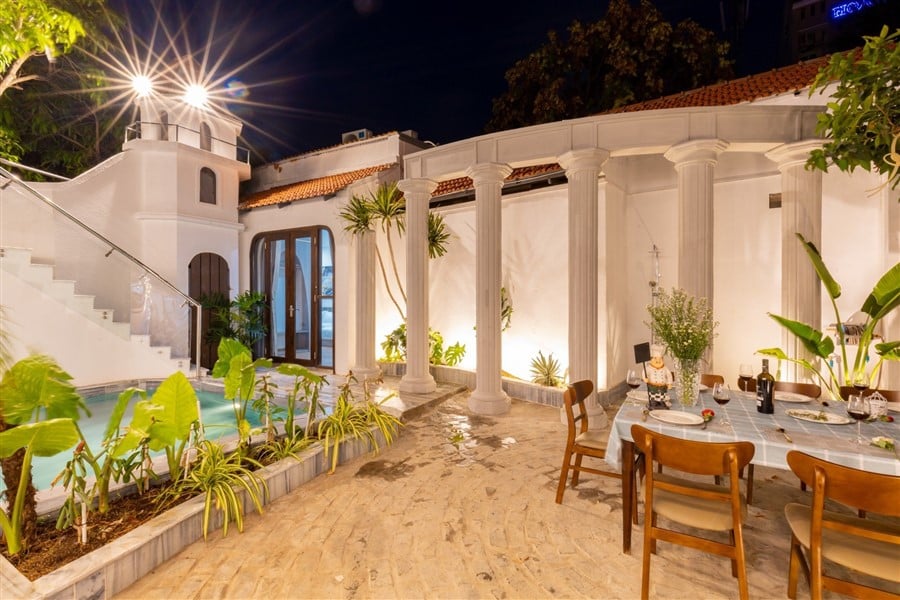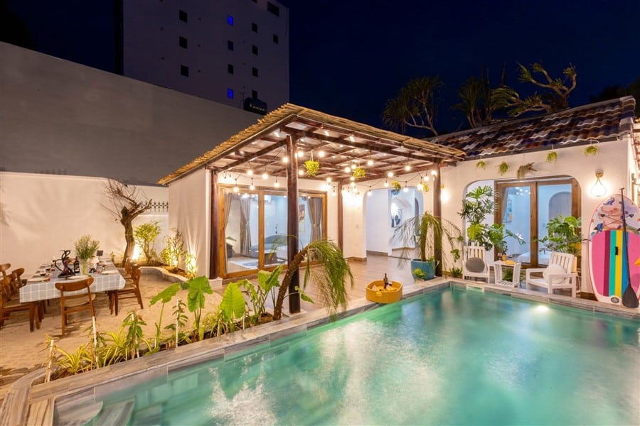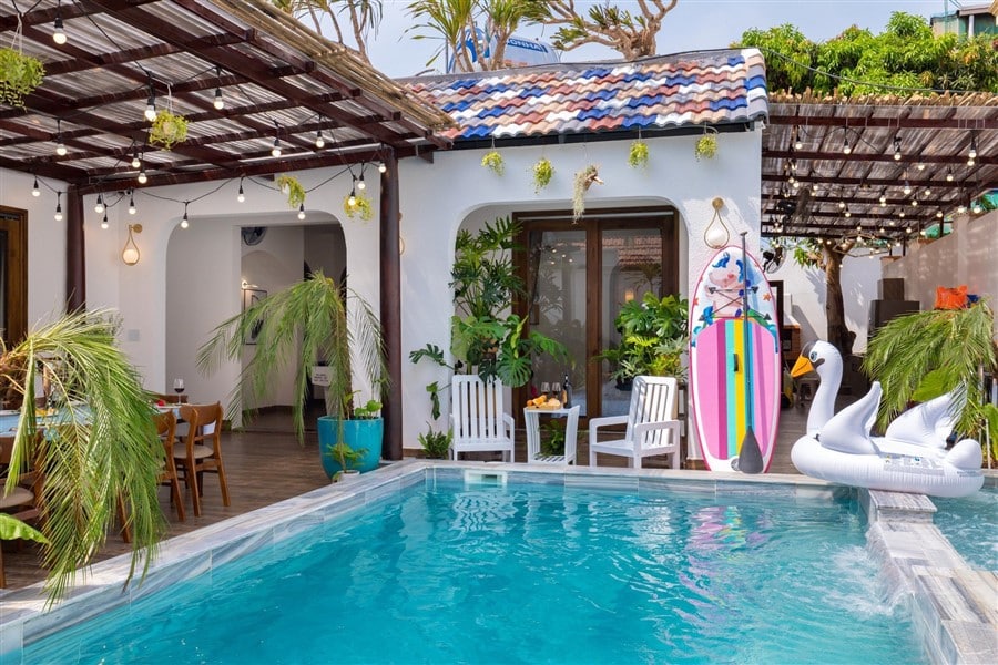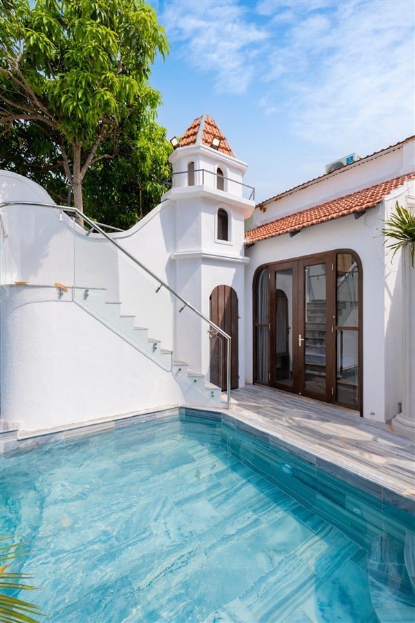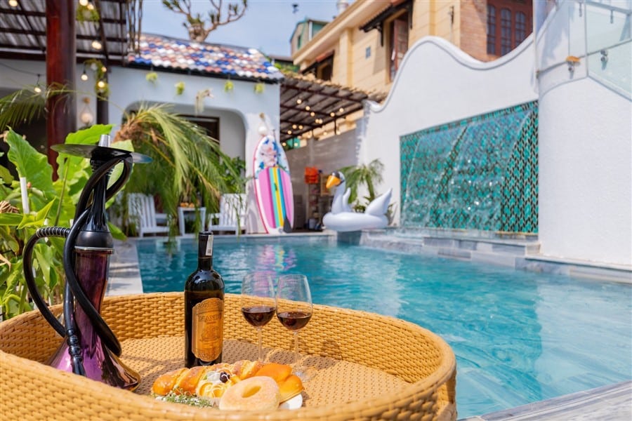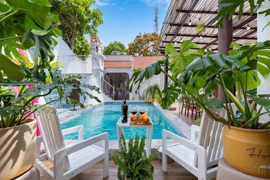 ✅ Hồ bơi riêng siêu lớn 60m², có thác nước và góc check-in bồn tắm ngoài trời cực chill.