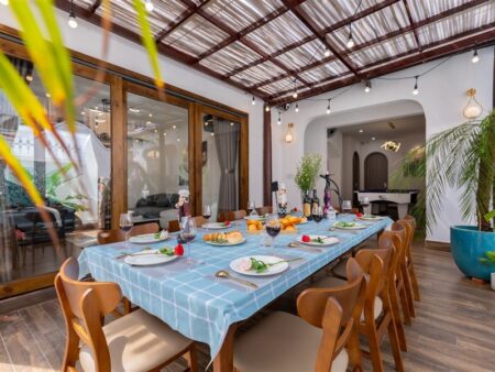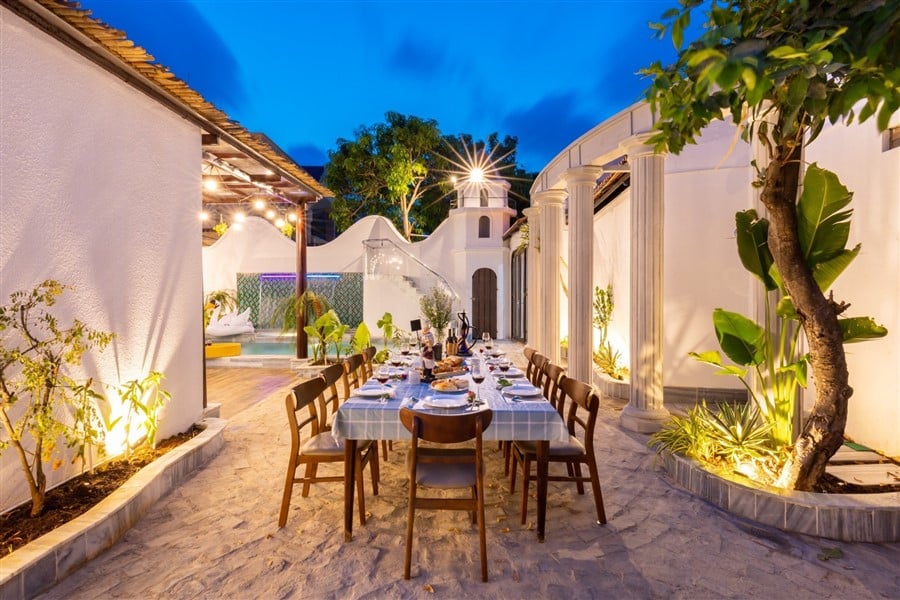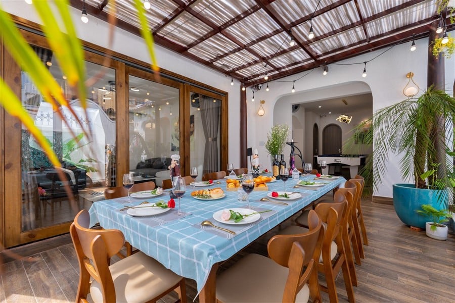 ✅ Sân vườn rộng rãi, có 3 bàn inox và 20 ghế nhậu ngoài trời, rất phù hợp để tổ chức tiệc BBQ, sinh nhật hoặc họp mặt gia đình.