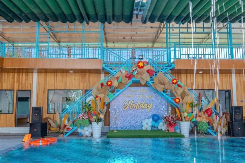 Hồ bơi: 150m², khu vực trẻ em 60cm, giàn phun nước, đèn đổi màu, phao bơi, sup miễn phí, máy bắn tạo bọt tuyết