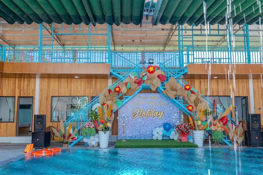 Hồ bơi 150m², khu vực trẻ em 60cm, giàn phun nước, đèn đổi màu, phao bơi, sup miễn phí và máy tạo bọt tuyết, mang đến trải nghiệm bơi lội vui nhộn, thư giãn cho mọi lứa tuổi.