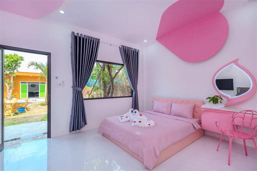 Homestay trang bị đầy đủ bếp nấu ăn và dụng cụ BBQ: bếp gas, lò nướng BBQ, nồi, chén dĩa, dao kéo, thớt, gia vị cơ bản. Phòng khách rộng, máy lạnh, TV màn hình lớn, ghế sofa sang trọng, phòng karaoke riêng cách âm 24/24. Máy giặt, khu vực phơi đồ, tủ lạnh cỡ lớn và quầy snack bar tính phí. Quản gia hỗ trợ 24/7 và check-in sớm nếu homestay trống.