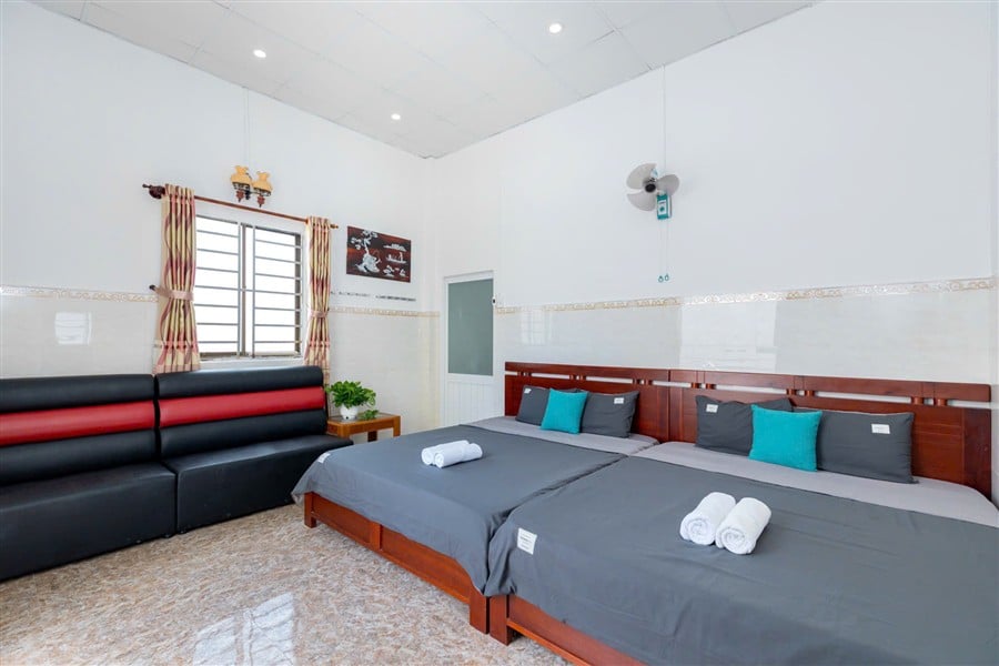 Căn nhà gồm 4 phòng ngủ, 6 giường, nệm phụ miễn phí theo yêu cầu và 5 phòng vệ sinh riêng, phù hợp cho nhóm từ 12 đến 20 khách. Phòng Master rộng rãi có ban công hướng ra biển và núi, mang đến không gian nghỉ dưỡng lý tưởng.