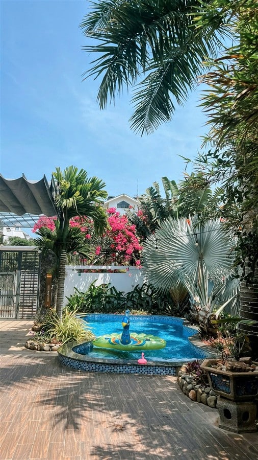 Homestay có hồ bơi ngoài trời rộng 25m², phao bơi và đồ chơi hồ bơi, có tính năng mát-xa toàn thân, lý tưởng để bơi lội, thư giãn hoặc vui chơi cùng gia đình và nhóm bạn. Sân thượng rộng rãi kết hợp khu vực BBQ ngoài trời với bếp nướng, bàn ăn lớn, ghế ngồi, xích đu và bàn inox phụ trợ, đủ chỗ tổ chức tiệc cho nhóm đông, sinh nhật, liên hoan hoặc team-building.