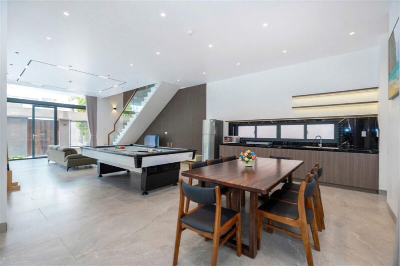 Bếp được trang bị đầy đủ: bếp gas, bếp nướng BBQ, lò vi sóng, tủ lạnh, nồi, chén dĩa, dụng cụ nấu bếp và gia vị cơ bản. Homestay còn có máy giặt, bàn ủi, phòng khách rộng rãi, chăn ga gối tiêu chuẩn khách sạn. Quản gia hỗ trợ 24/7, đồng thời hỗ trợ check-in sớm theo tình hình thực tế, đảm bảo trải nghiệm tiện nghi và thoải mái tối đa cho khách hàng.