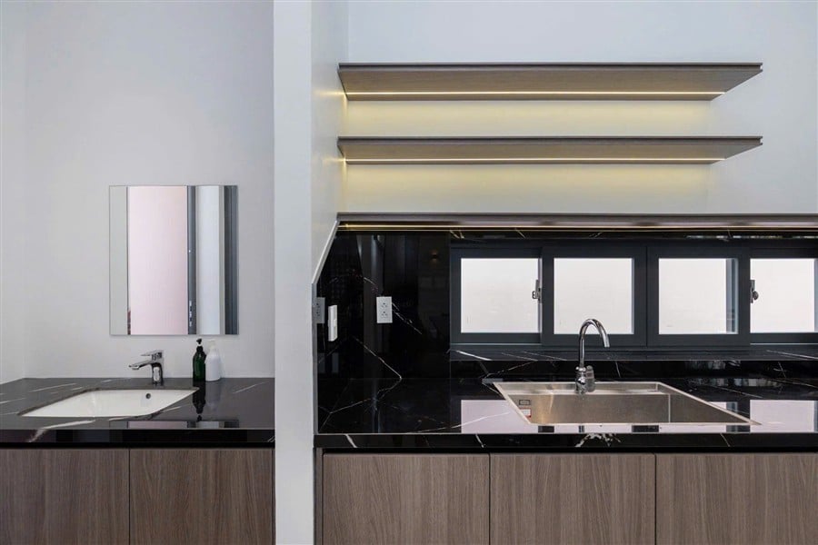Tầng trệt: 1 phòng đơn, phòng khách, bếp, gara, WC