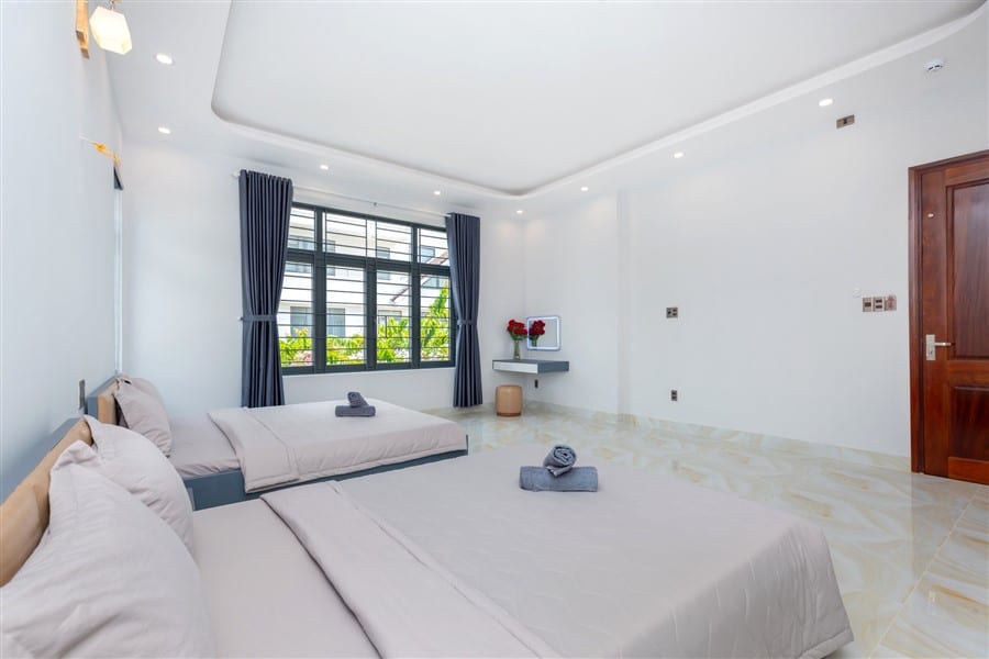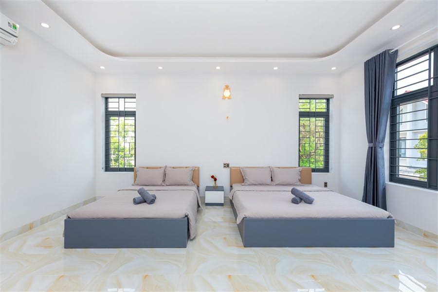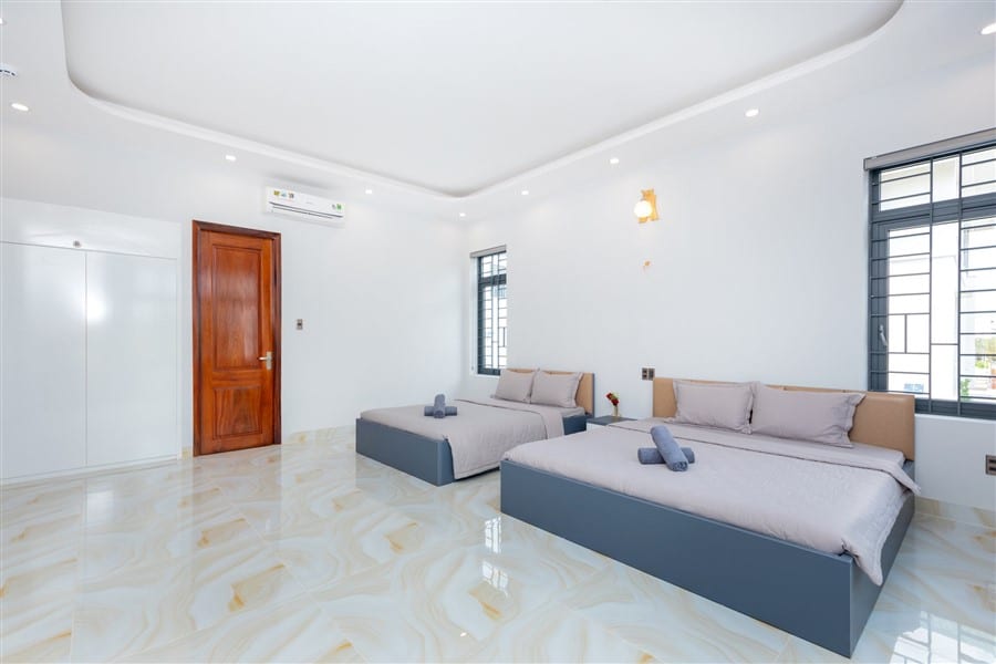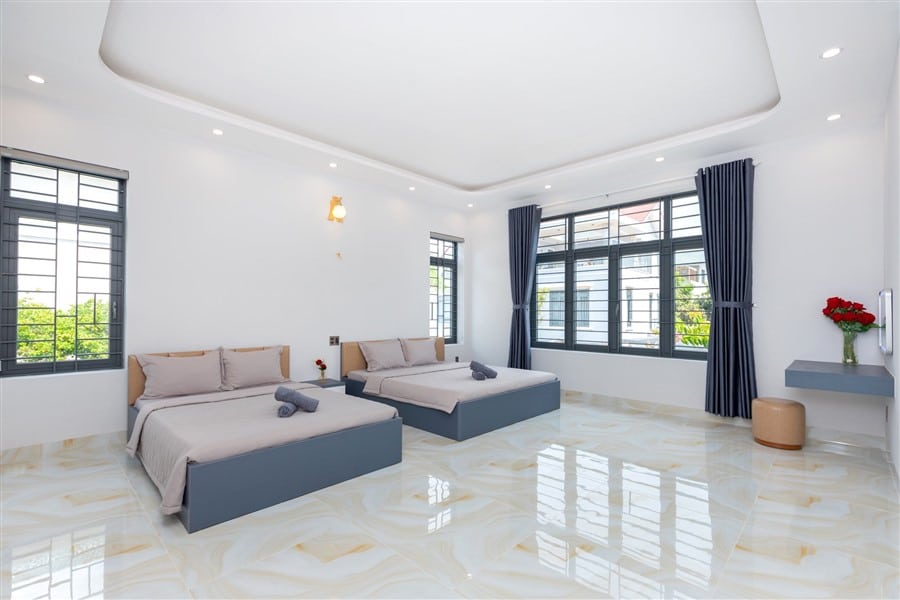Homestay sở hữu 12 phòng ngủ, gồm 3 phòng đôi và 9 phòng đơn, tổng cộng 12 giường 1m8 và 3 giường 1m4, kết hợp 5 nệm phụ, sức chứa tối đa lên đến 40 khách. Các phòng ngủ được bố trí hiện đại, thoáng mát, trang bị nội thất sang trọng, TV, máy lạnh và gương toàn thân, mang đến không gian nghỉ ngơi thoải mái. 13 WC tiện nghi với vòi tắm nóng lạnh, khăn tắm và đồ dùng cá nhân đáp ứng đầy đủ nhu cầu sinh hoạt cho tất cả khách lưu trú.