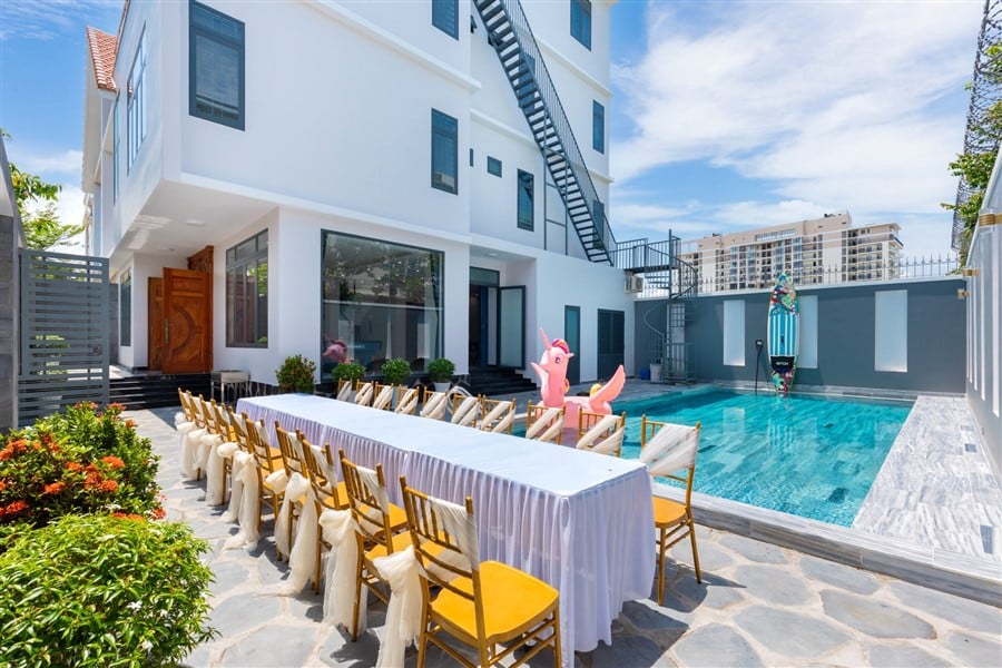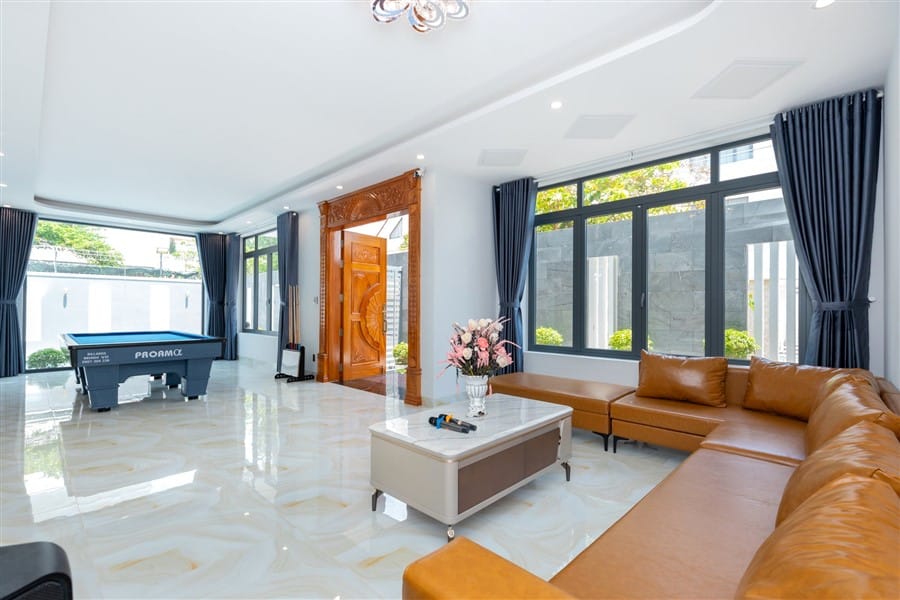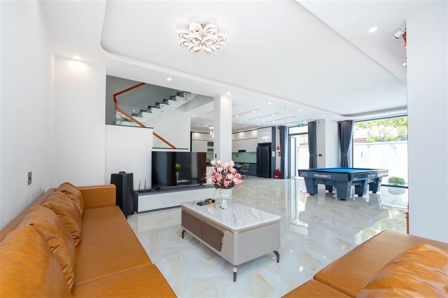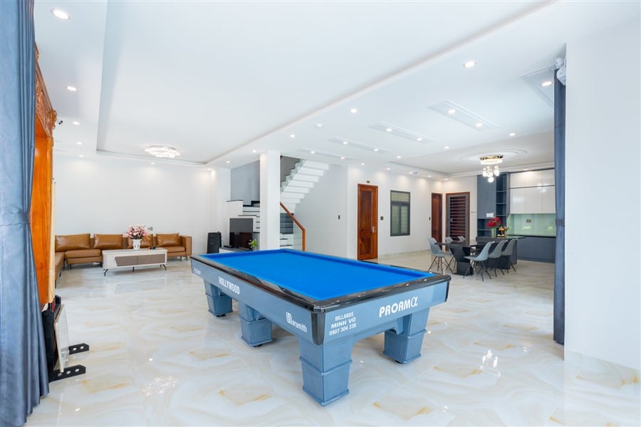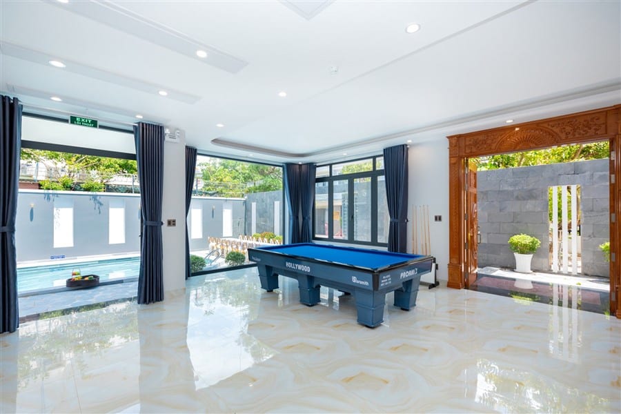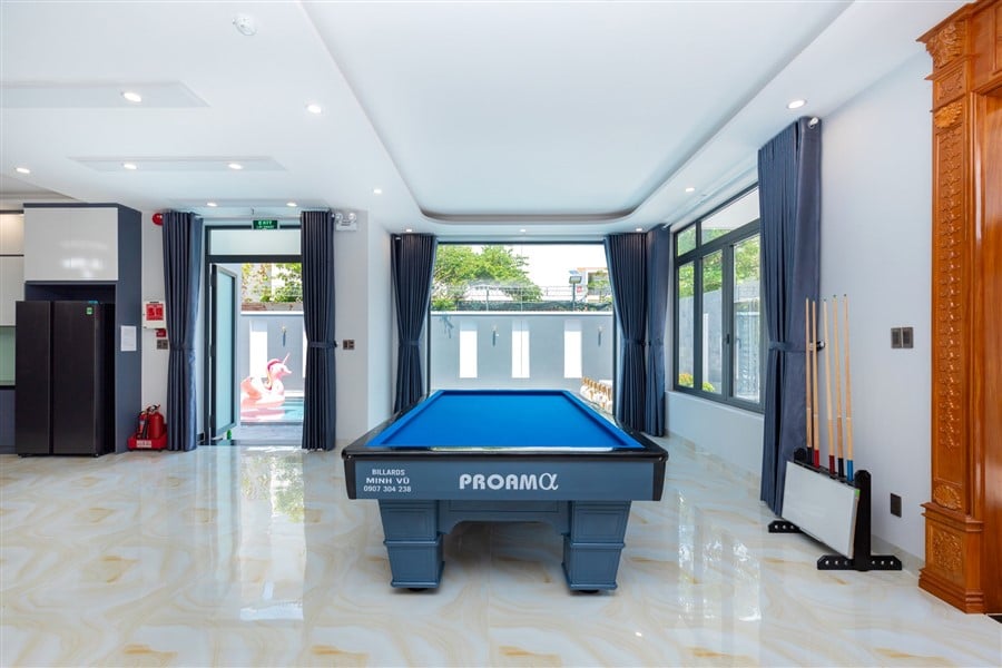 Hồ bơi riêng rộng, sân BBQ, phòng karaoke và bàn bida phục vụ giải trí