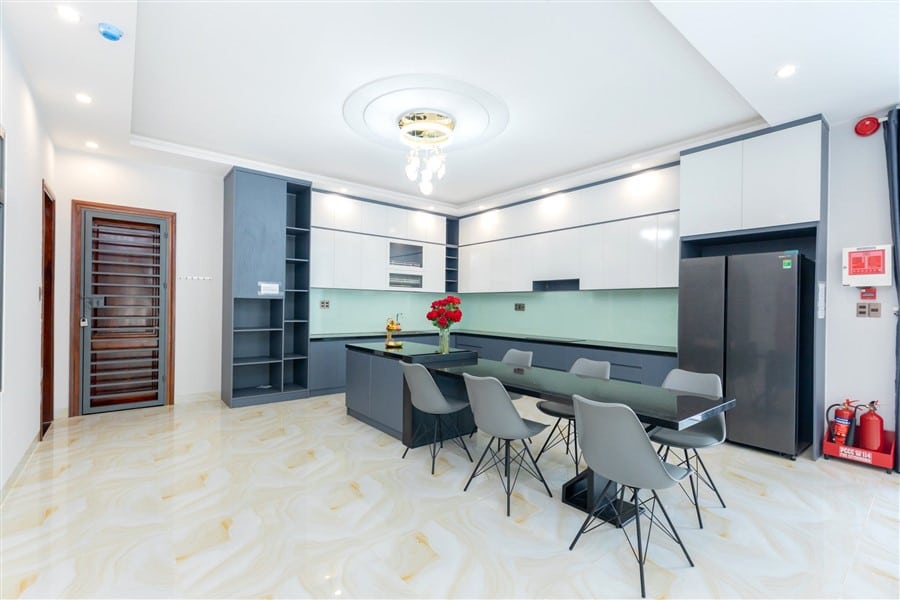 ✅ Khu bếp đầy đủ dụng cụ nấu nướng, đồ dùng cơ bản, gia vị và bàn ghế ăn rộng rãi