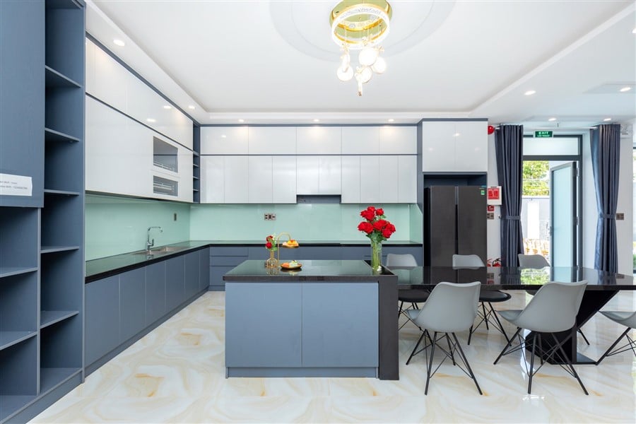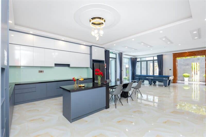 Khu bếp của homestay được trang bị đầy đủ dụng cụ nấu nướng, đồ dùng cơ bản và gia vị, kết hợp bàn ghế ăn rộng rãi, phục vụ các bữa ăn gia đình hoặc nhóm bạn. Gara rộng rãi có thể đậu được 3 xe, sân ngoài homestay và vỉa hè đủ chỗ cho xe 45 chỗ, thuận tiện cho đoàn khách đông di chuyển bằng xe lớn.