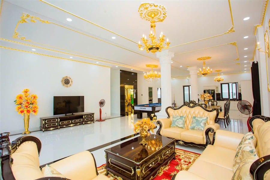 Phòng khách rộng rãi, máy lạnh, sofa sang trọng, TV màn hình lớn.
