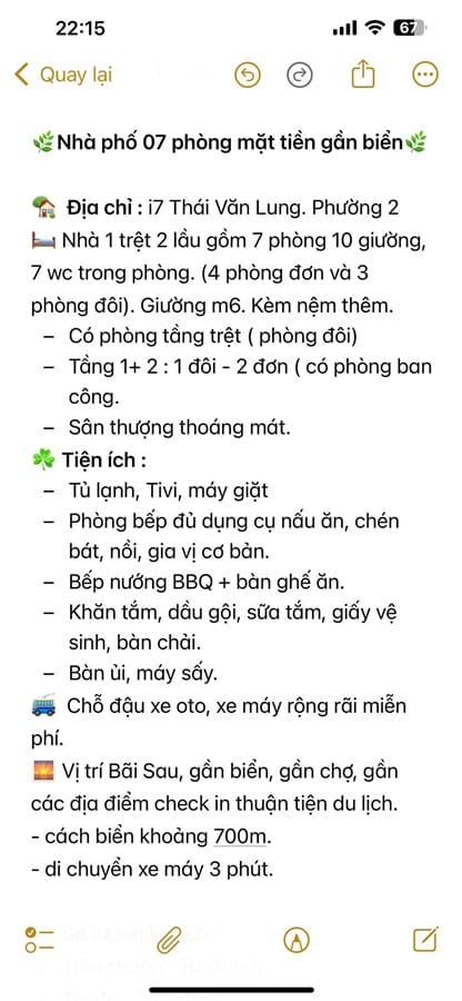 Homestay i7 Thái Văn Lung là lựa chọn lý tưởng cho các gia đình, nhóm bạn hoặc đoàn công ty muốn nghỉ dưỡng tại Vũng Tàu với không gian rộng rãi, tiện nghi và riêng tư. Nằm tại Phường 2, chỉ cách biển Bãi Sau khoảng 3 phút đi xe (600m), homestay mang đến sự thuận tiện tối đa để tận hưởng những buổi sáng trên bãi biển, tham gia các hoạt động vui chơi hoặc dạo bộ khám phá thành phố biển xinh đẹp. Đây là một trong những homestay Vũng Tàu cho thuê theo ngày được nhiều khách hàng ưa chuộng nhờ vị trí gần biển, thiết kế hiện đại và tiện nghi đầy đủ.