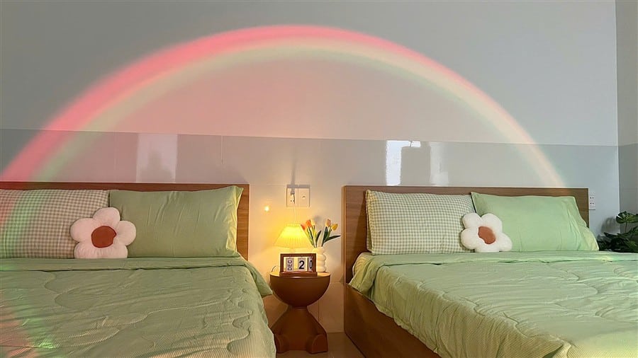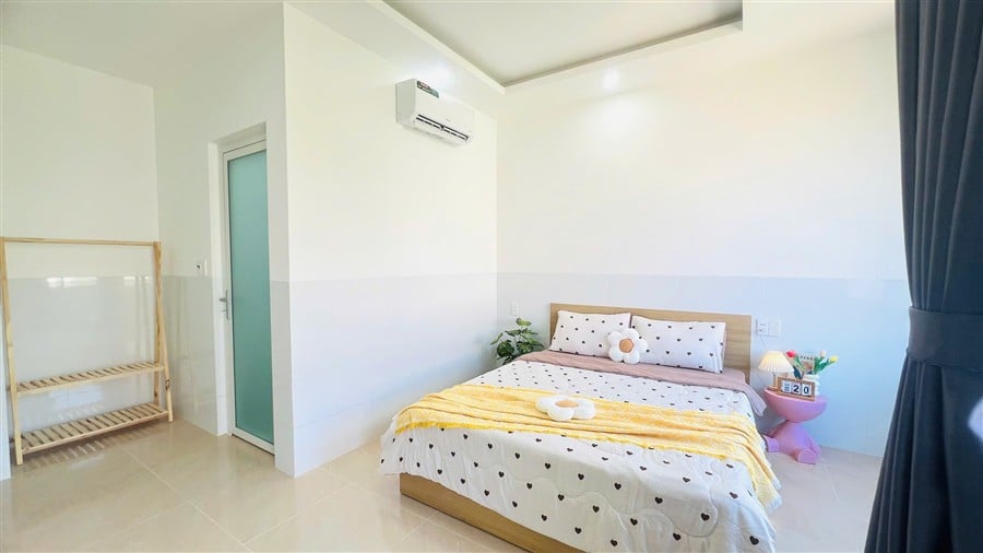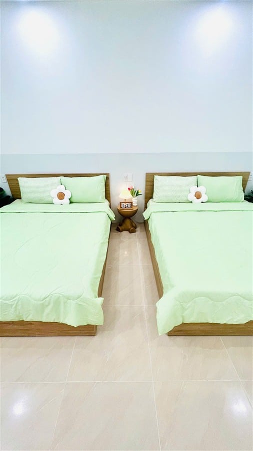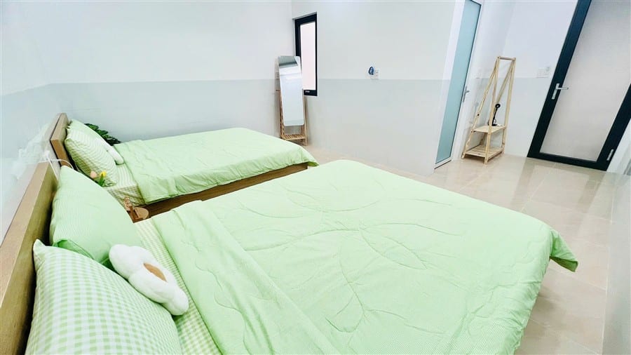 Căn homestay gồm 1 trệt và 2 lầu, được bố trí 7 phòng ngủ với 10 giường và 3 nệm phụ, bao gồm 4 phòng đơn và 3 phòng đôi, sức chứa tiêu chuẩn 15 khách và tối đa lên tới 30 khách. Tầng trệt có phòng đôi, phòng khách và bếp đầy đủ tiện nghi; tầng 1 và 2 gồm các phòng đơn và phòng đôi; sân thượng thoáng đãng là nơi lý tưởng để thư giãn, tổ chức các hoạt động ngoài trời hoặc tiệc nướng nhóm. Mỗi phòng đều có WC riêng, nội thất tiện nghi giúp cả gia đình hoặc nhóm bạn tận hưởng kỳ nghỉ thoải mái như ở chính ngôi nhà của mình.