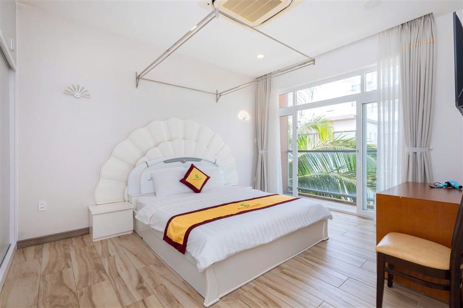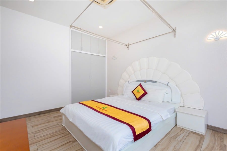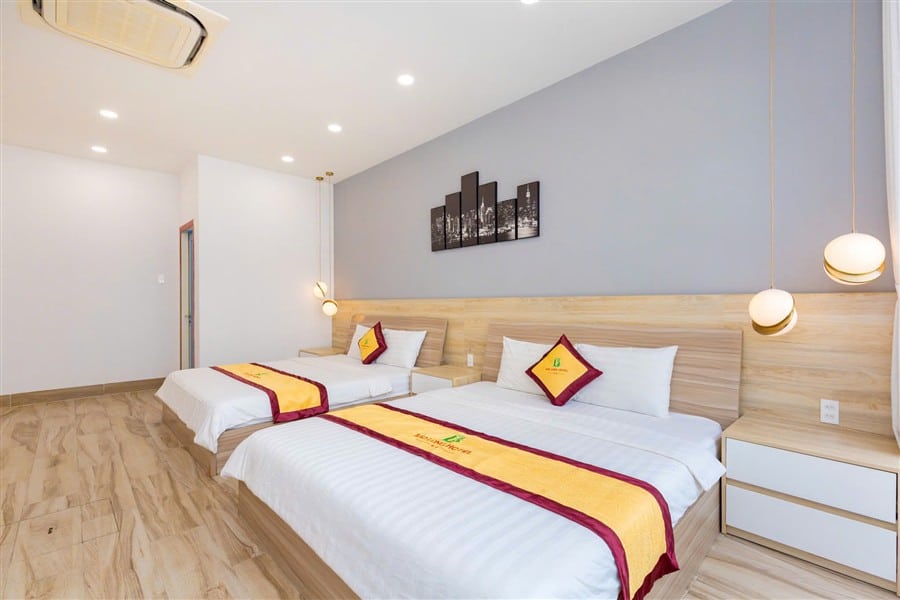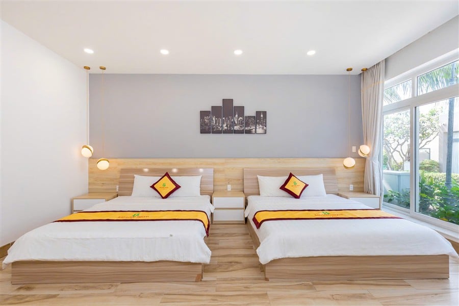Homestay gồm 3 phòng ngủ, 4 giường 1m8 và 3 nệm phụ, sức chứa tiêu chuẩn 12 người lớn và 3 bé. Trong đó, 2 phòng ngủ nằm ở tầng trệt, thuận tiện cho người lớn tuổi, một phòng ngủ không có WC riêng. 3 WC tiện nghi với vòi tắm nóng lạnh và đồ dùng cá nhân đảm bảo tiện lợi cho mọi nhu cầu sinh hoạt. Nội thất hiện đại, phòng ngủ thoáng mát, trang bị đầy đủ TV, máy lạnh và gương toàn thân.