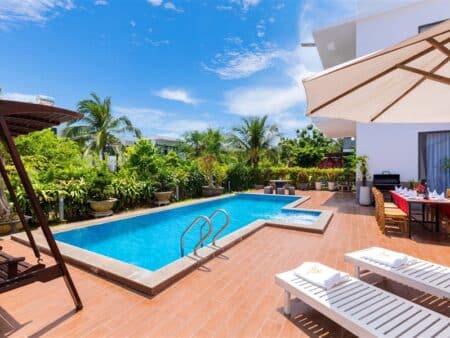 ✅ Không gian sang trọng – hiện đại: Diện tích 450m² với hồ bơi riêng, sân BBQ, gara và phòng khách lớn.