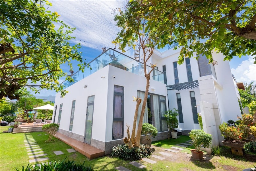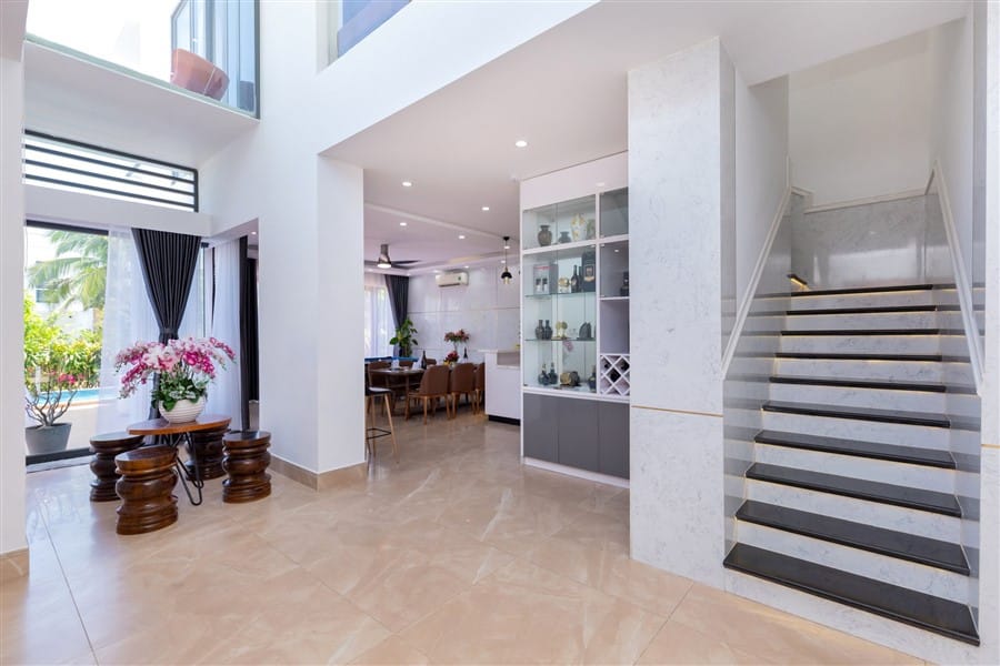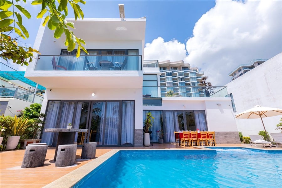 Với diện tích 450m², thiết kế 2 lầu – 1 trệt, homestay mang phong cách sang trọng pha chút nhiệt đới, có 4 phòng ngủ, 5 WC và hồ bơi riêng. Chỉ cách biển 30m, bạn có thể đi bộ vài bước là chạm chân cát trắng, đắm mình trong không khí biển trong lành.