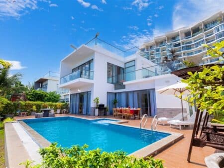 ✅ Không gian sang trọng – hiện đại: Diện tích 450m² với hồ bơi riêng, sân BBQ, gara và phòng khách lớn.