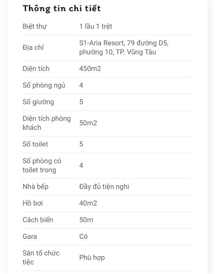 Homestay nằm tại R1-Aria Resort, 79 đường D5, phường 10, TP. Vũng Tàu, chỉ 20m ra đến bãi tắm riêng, mang đến trải nghiệm thư giãn tuyệt vời giữa thiên nhiên biển trong lành. Với diện tích 450m², thiết kế 2 lầu – 1 trệt, 4 phòng ngủ, 5 WC, hồ bơi riêng và nhiều tiện ích cao cấp, nơi đây đáp ứng hoàn hảo cho nhóm 10–15 khách là gia đình hoặc nhóm bạn thân.